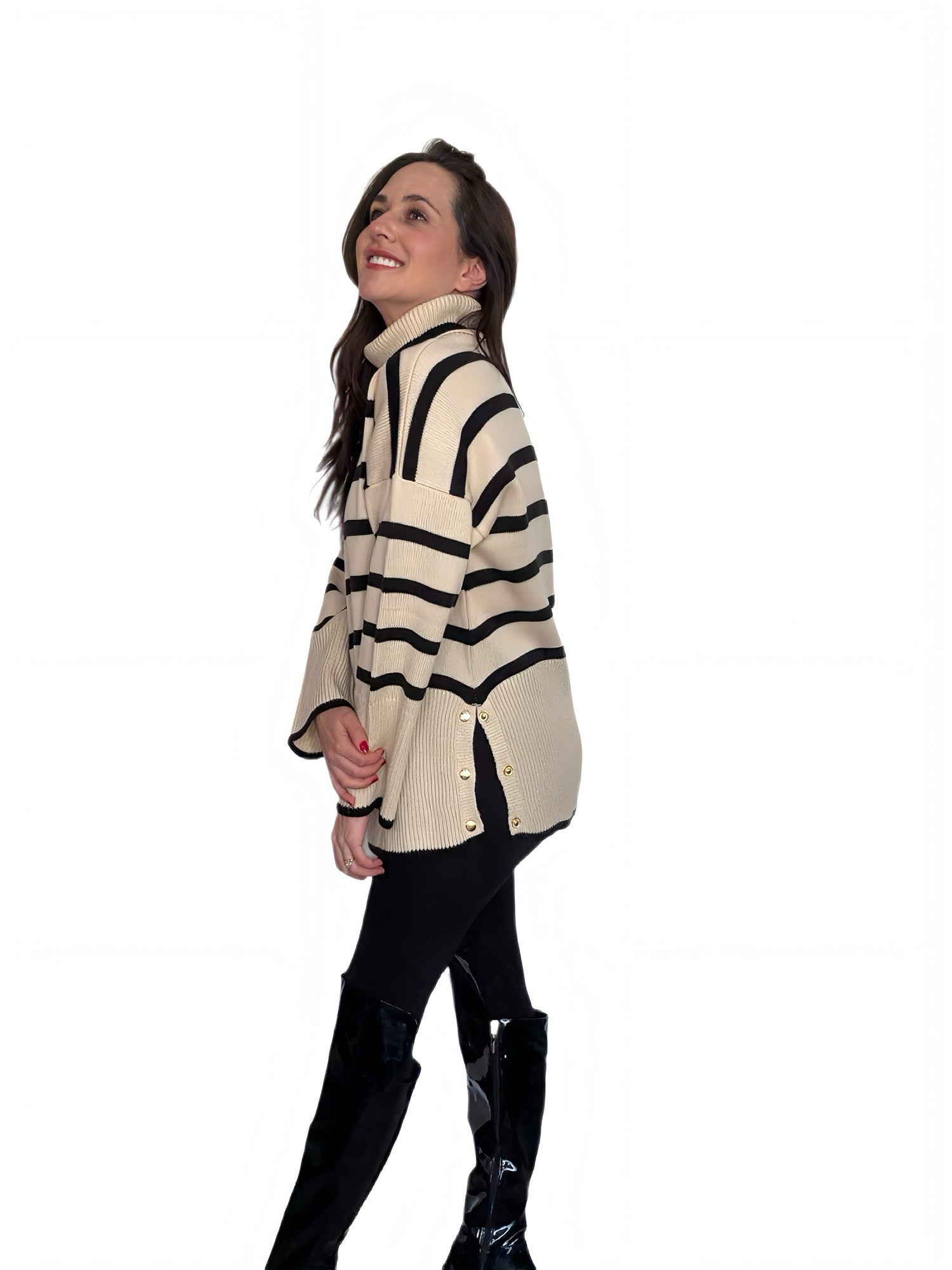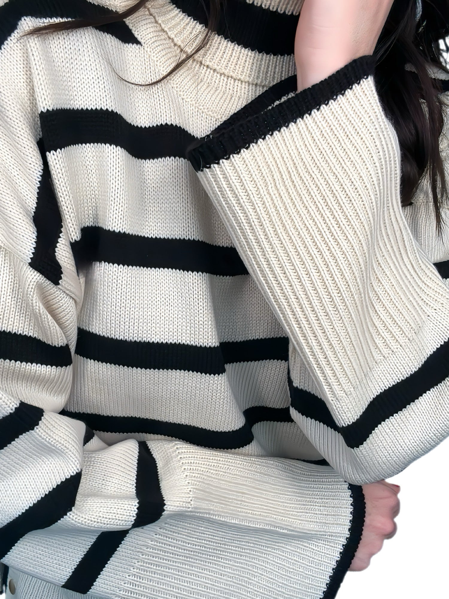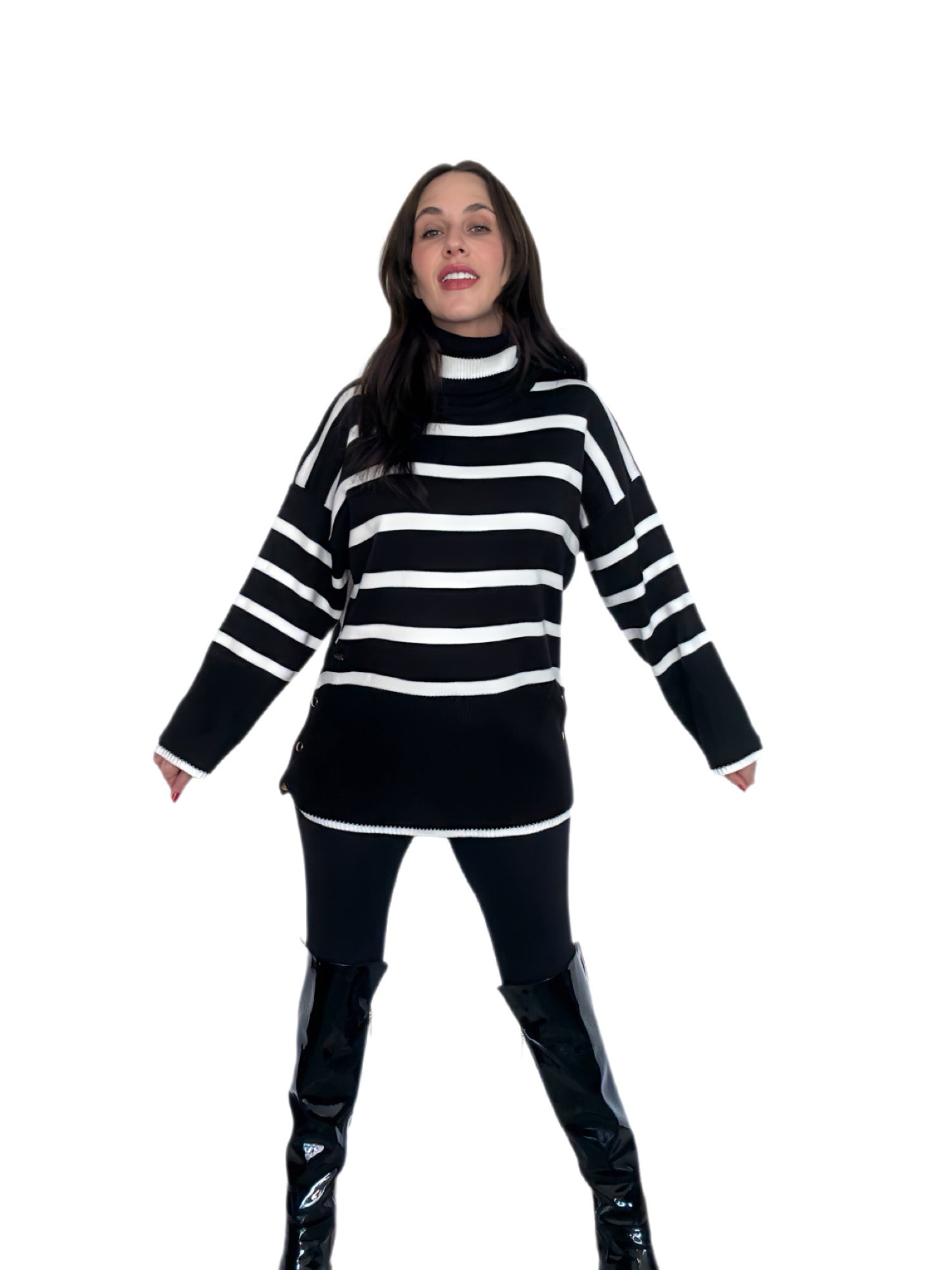 Diseñado en talla única que se ajusta desde la S hasta la XL, es una prenda versátil que se adapta a diferentes cuerpos y estilos de vida. Su cuello tortuga amplio añade un toque elegante y abrigador, mientras que las rayas horizontales lo convierten en un clásico moderno.