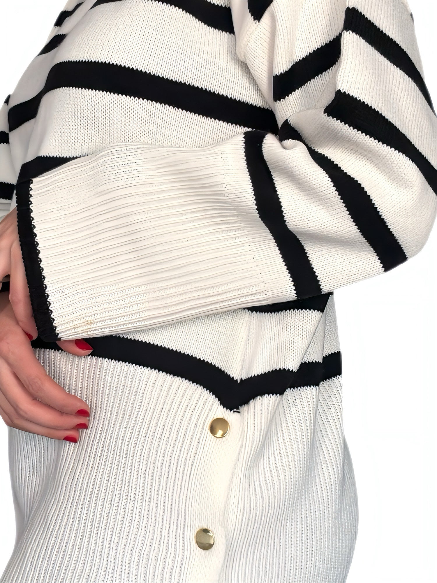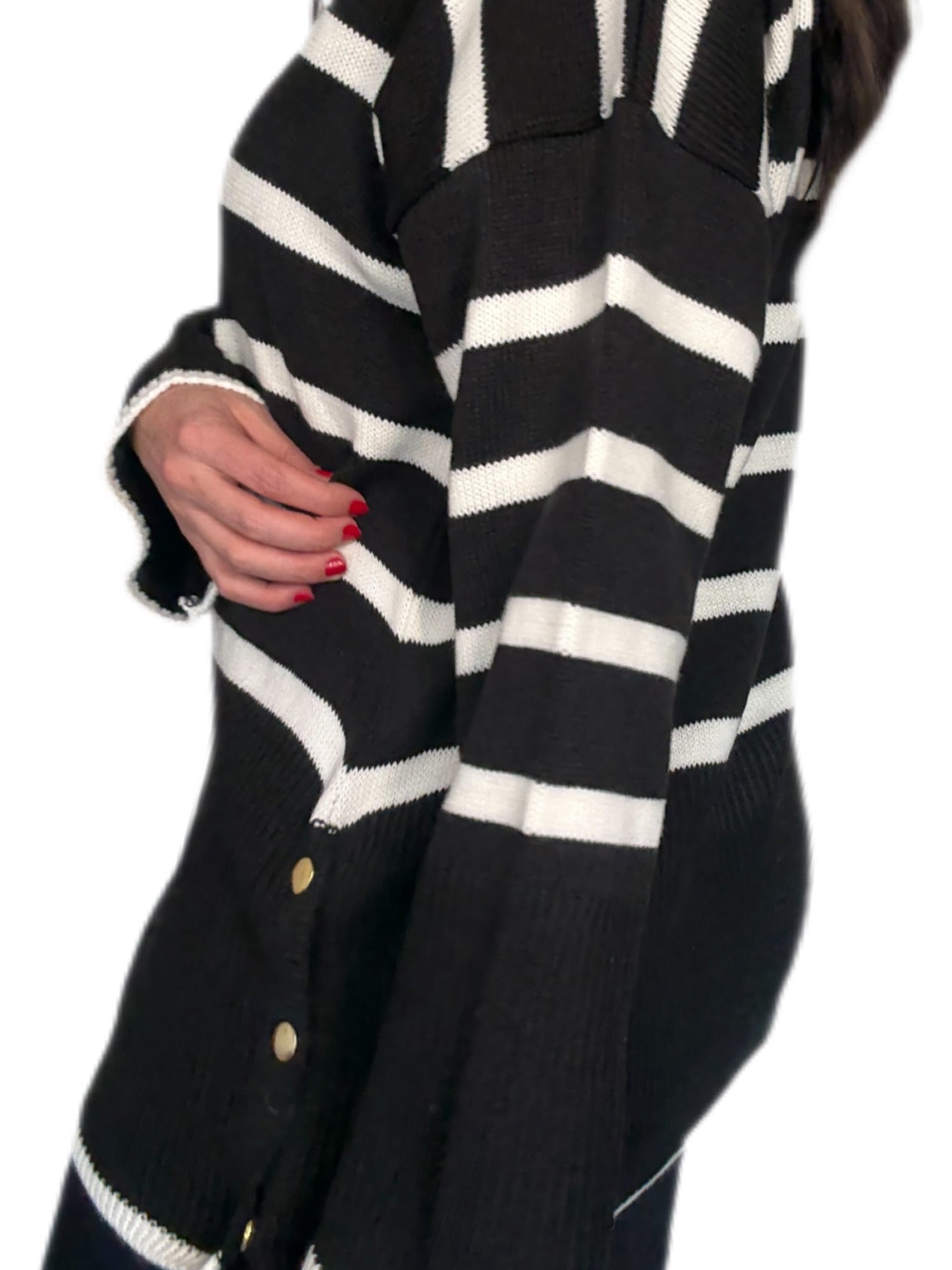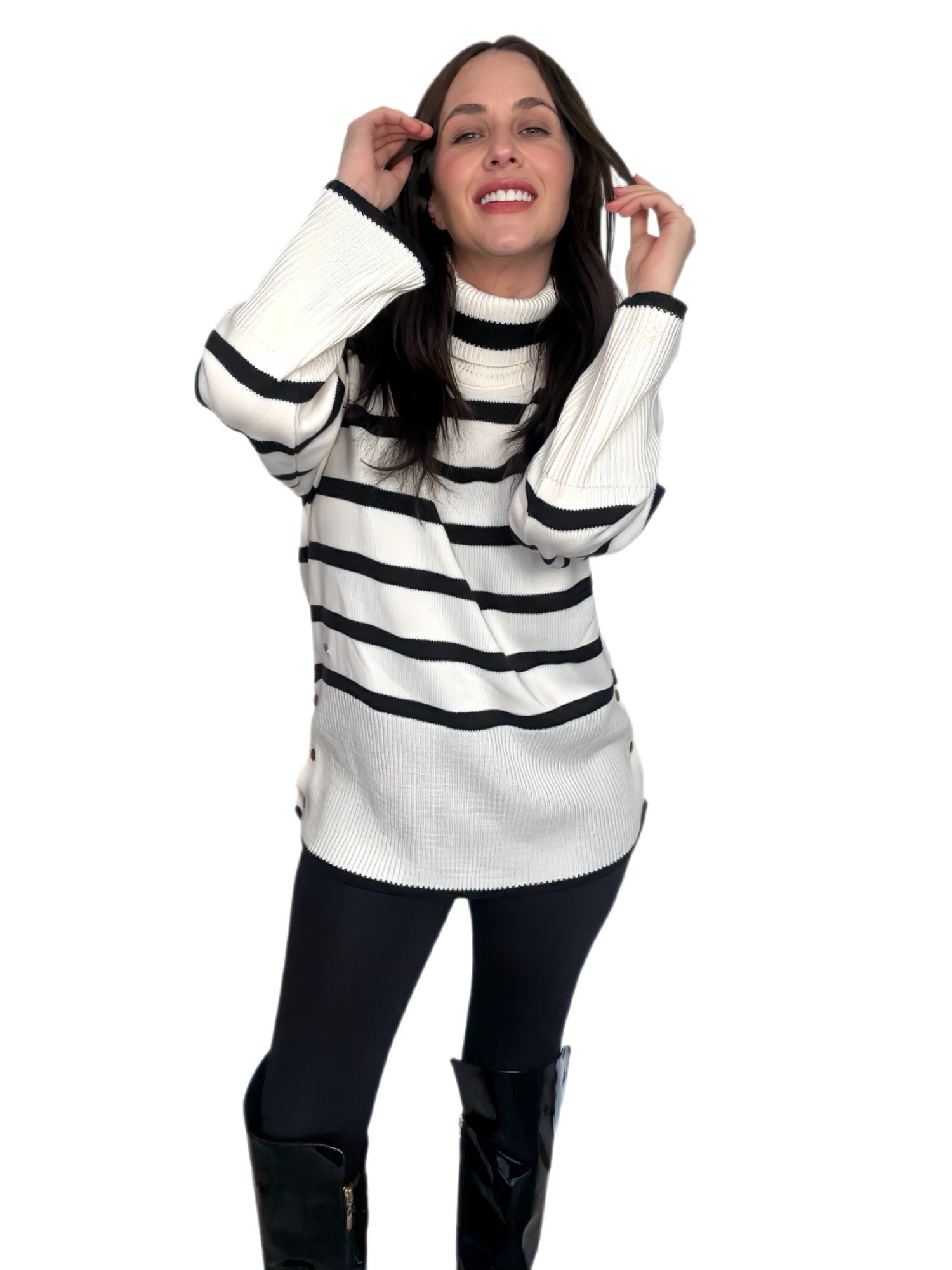 Diseñado en talla única que se ajusta desde la S hasta la XL, es una prenda versátil que se adapta a diferentes cuerpos y estilos de vida. Su cuello tortuga amplio añade un toque elegante y abrigador, mientras que las rayas horizontales lo convierten en un clásico moderno.