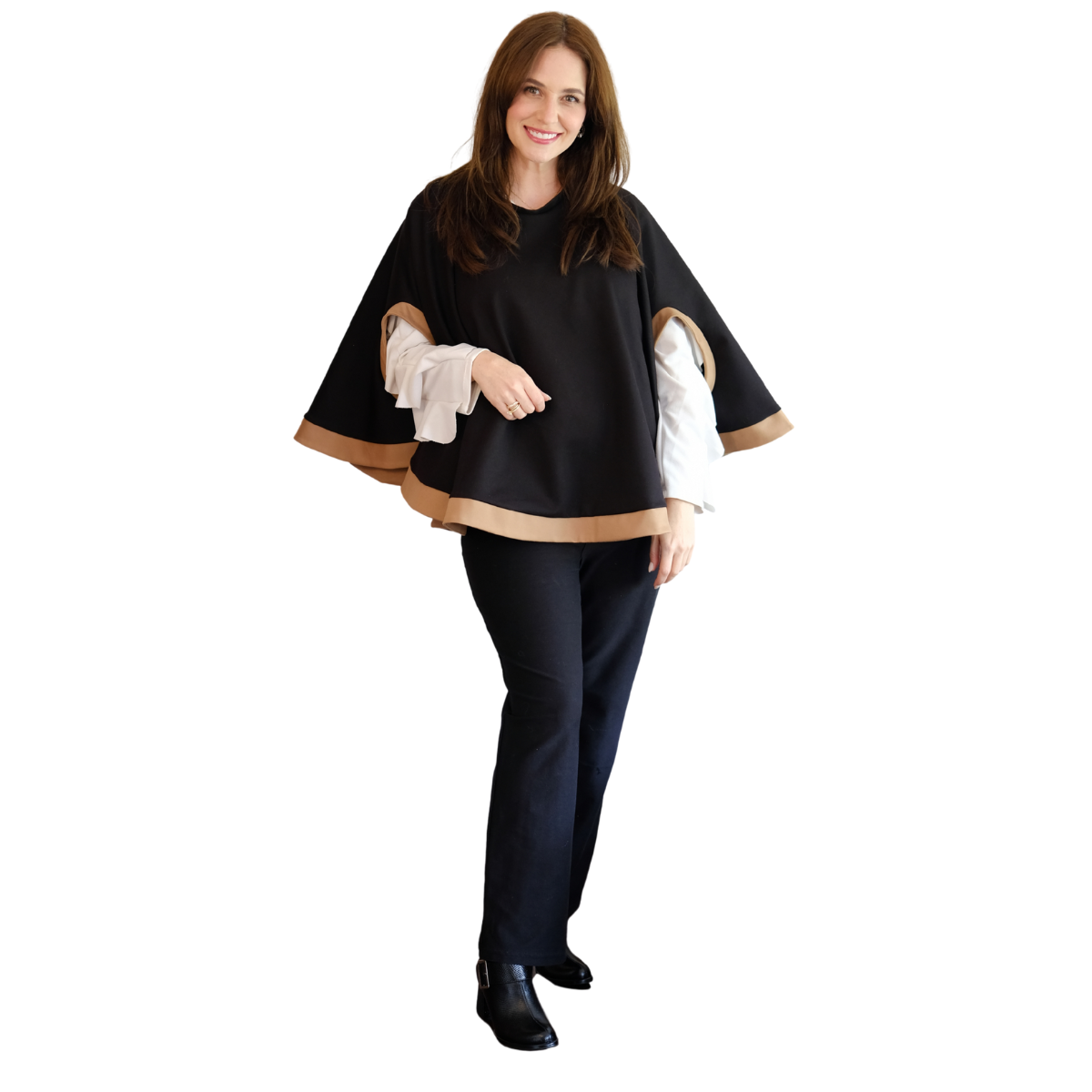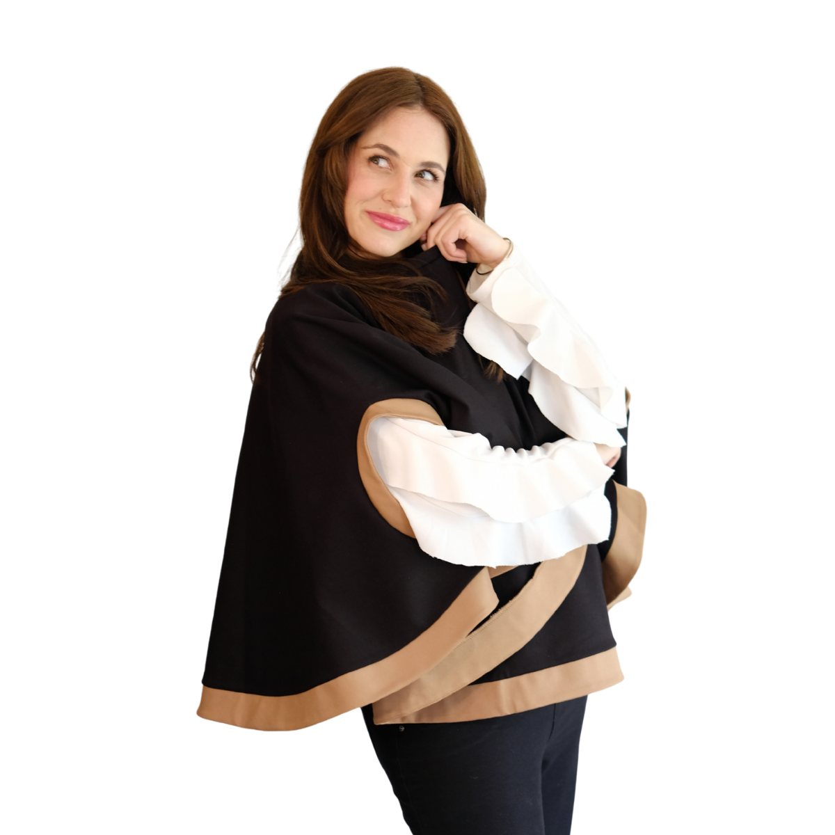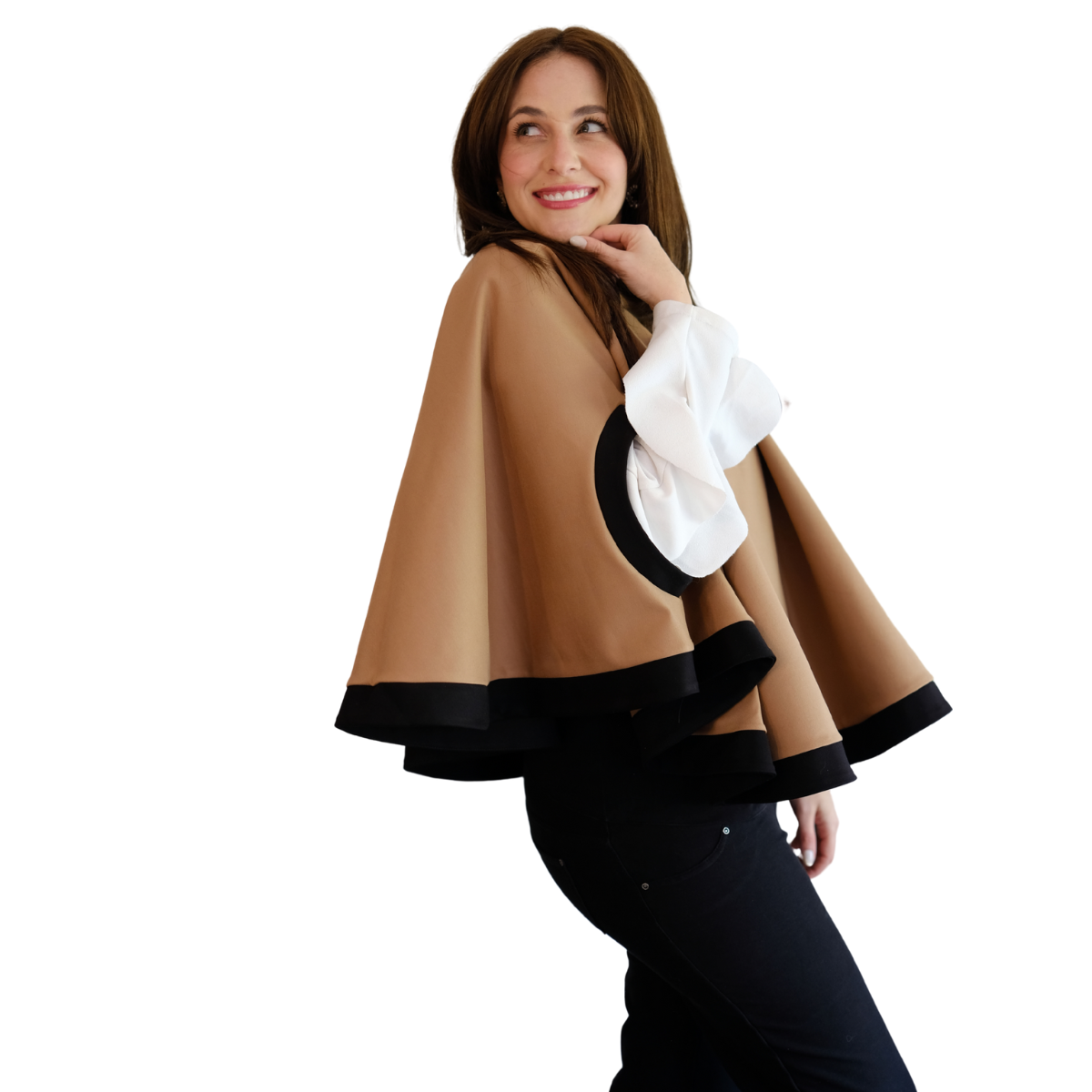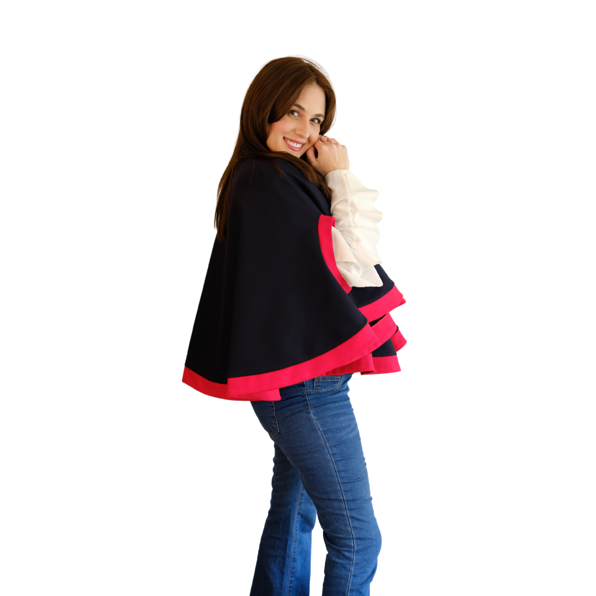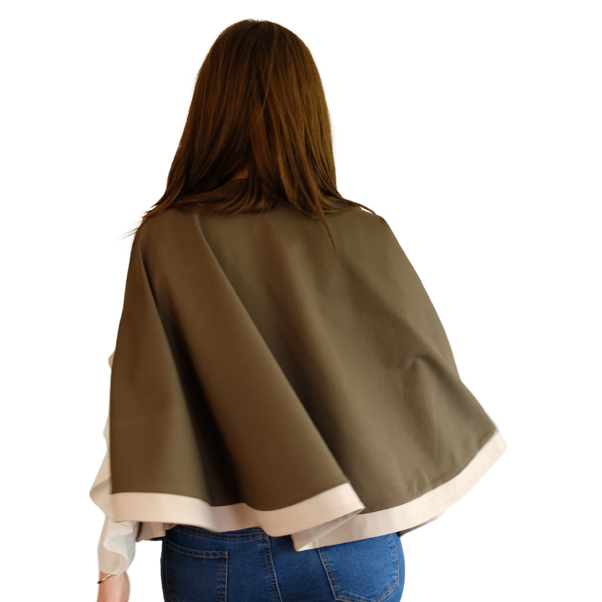 Descripción Técnica: Capa talla única con cuello redondo, aberturas ovaladas frontales para mangas en contraste igual que los ruedos.