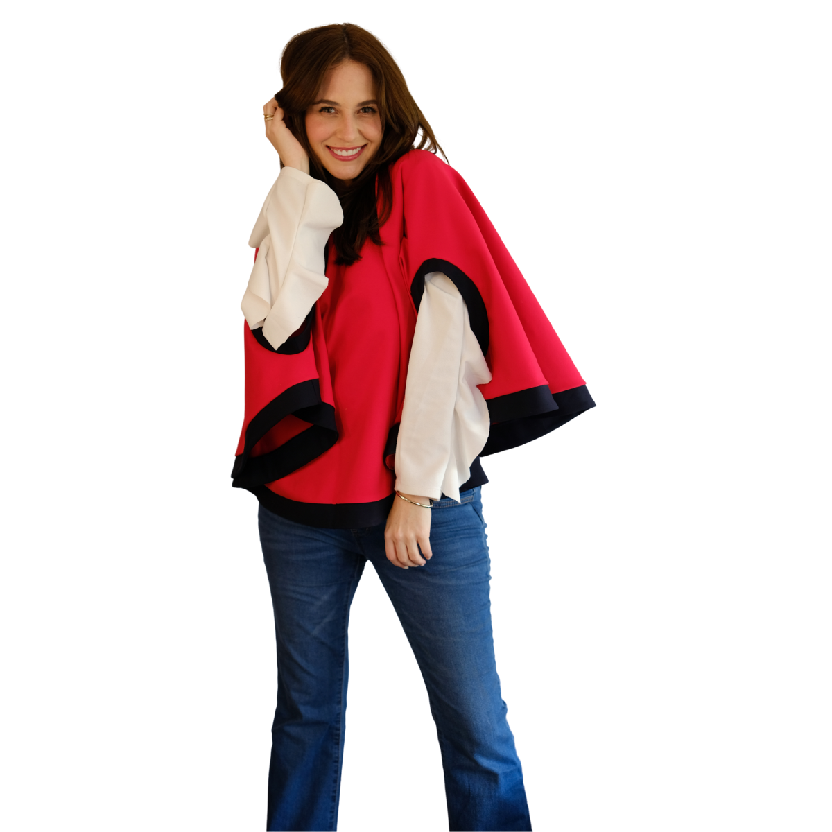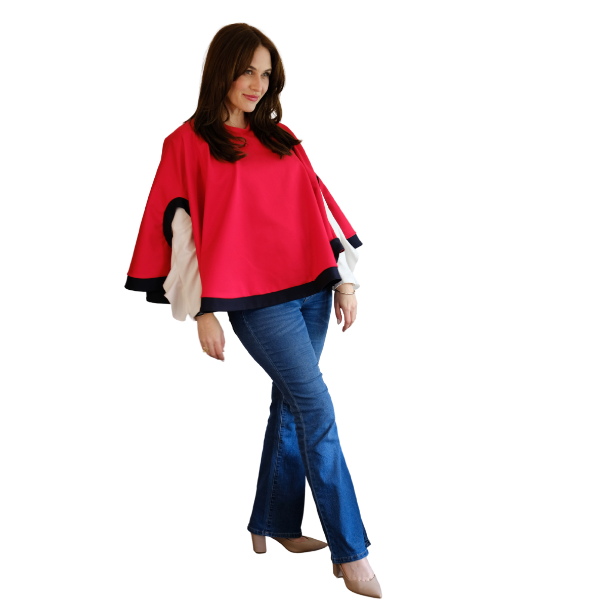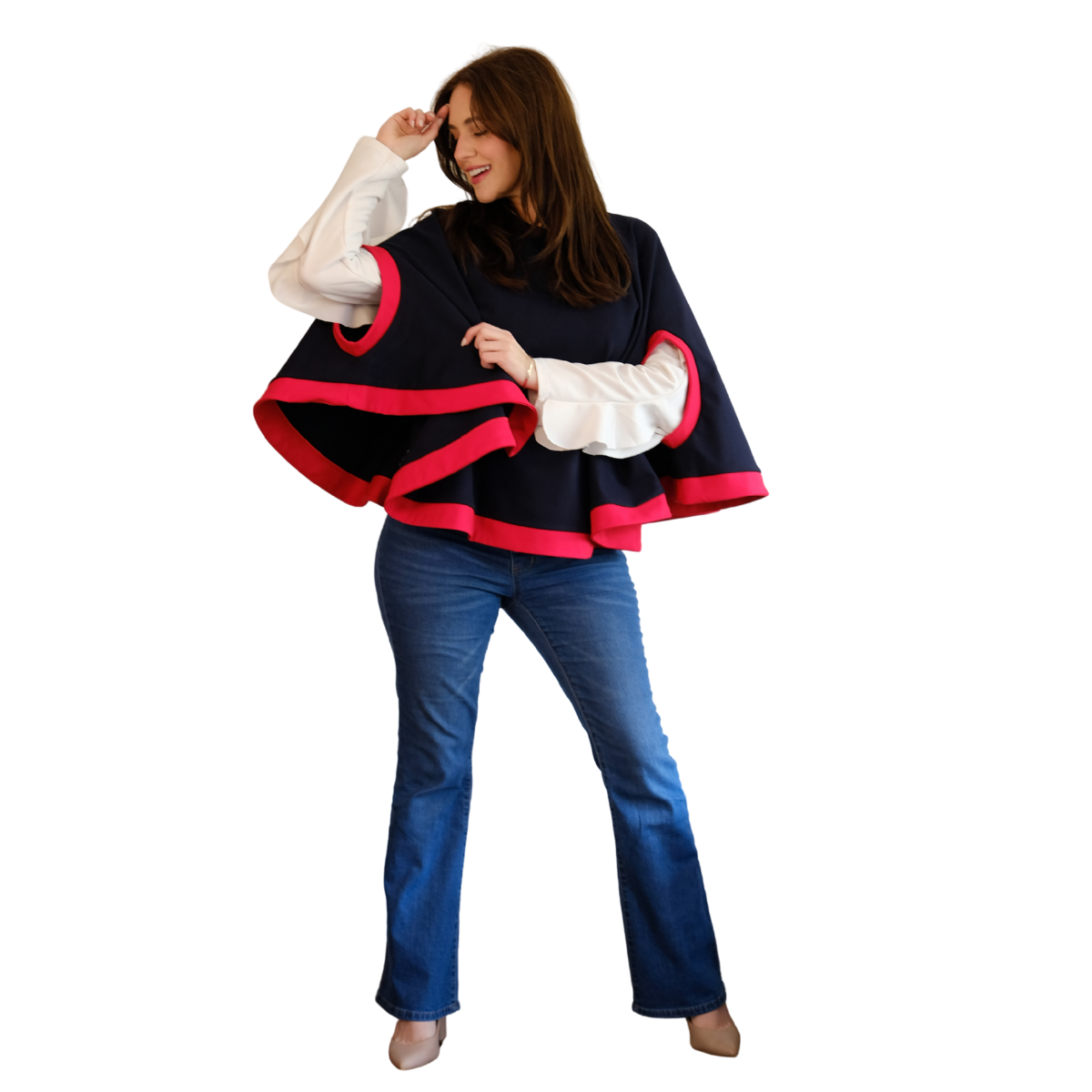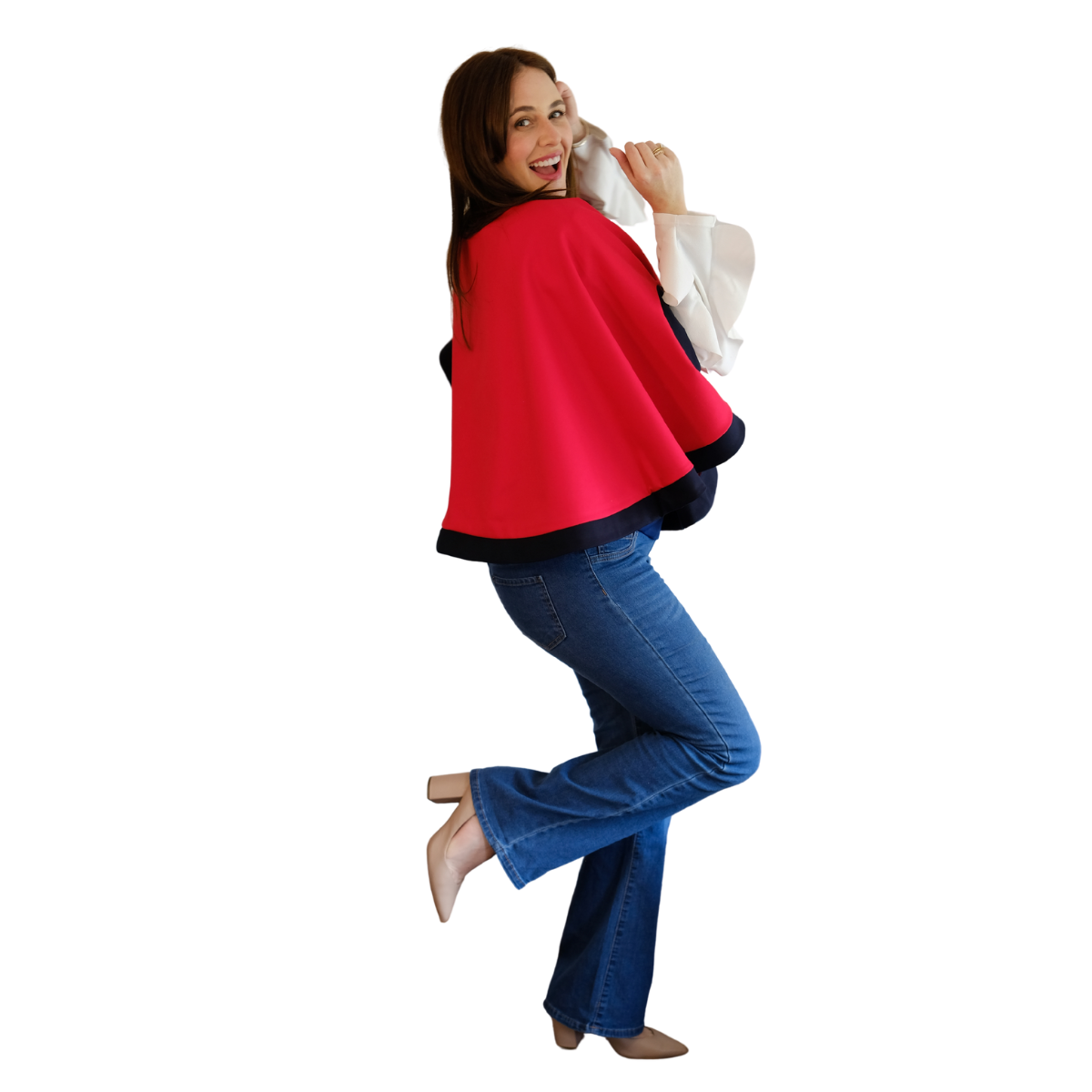 Descripción Técnica: Capa talla única con cuello redondo, aberturas ovaladas frontales para mangas en contraste igual que los ruedos.