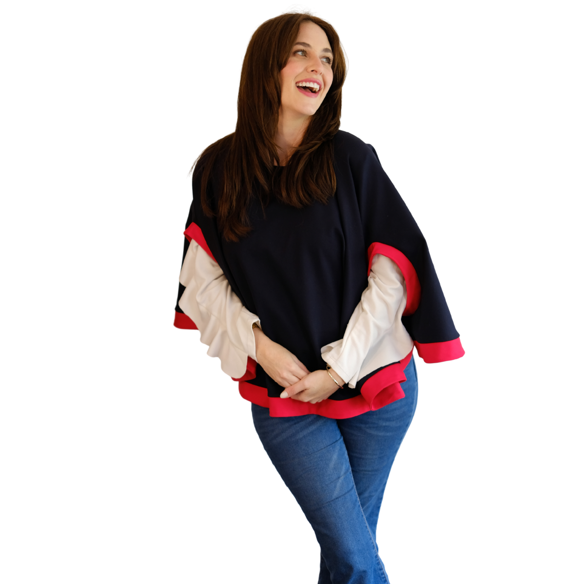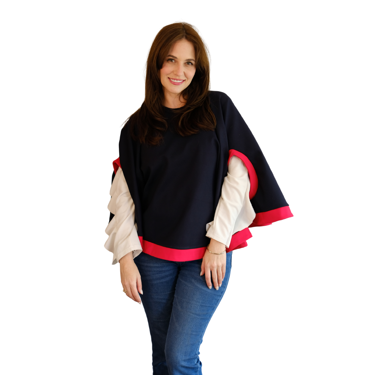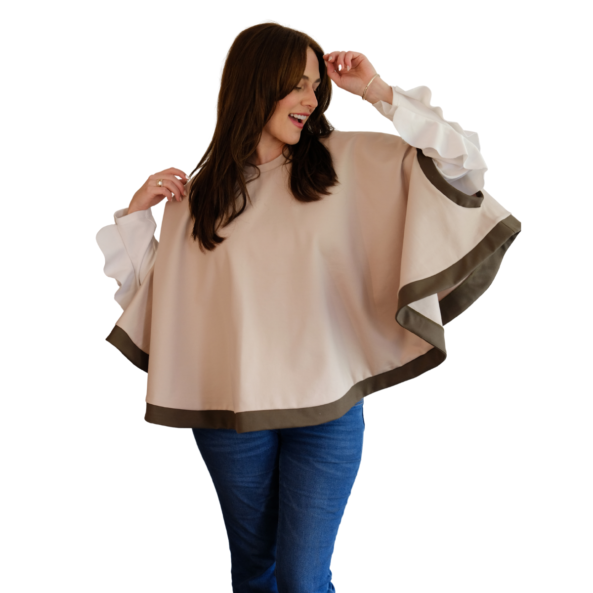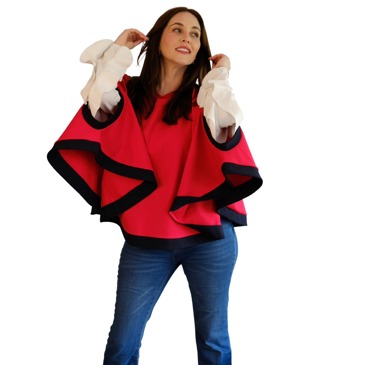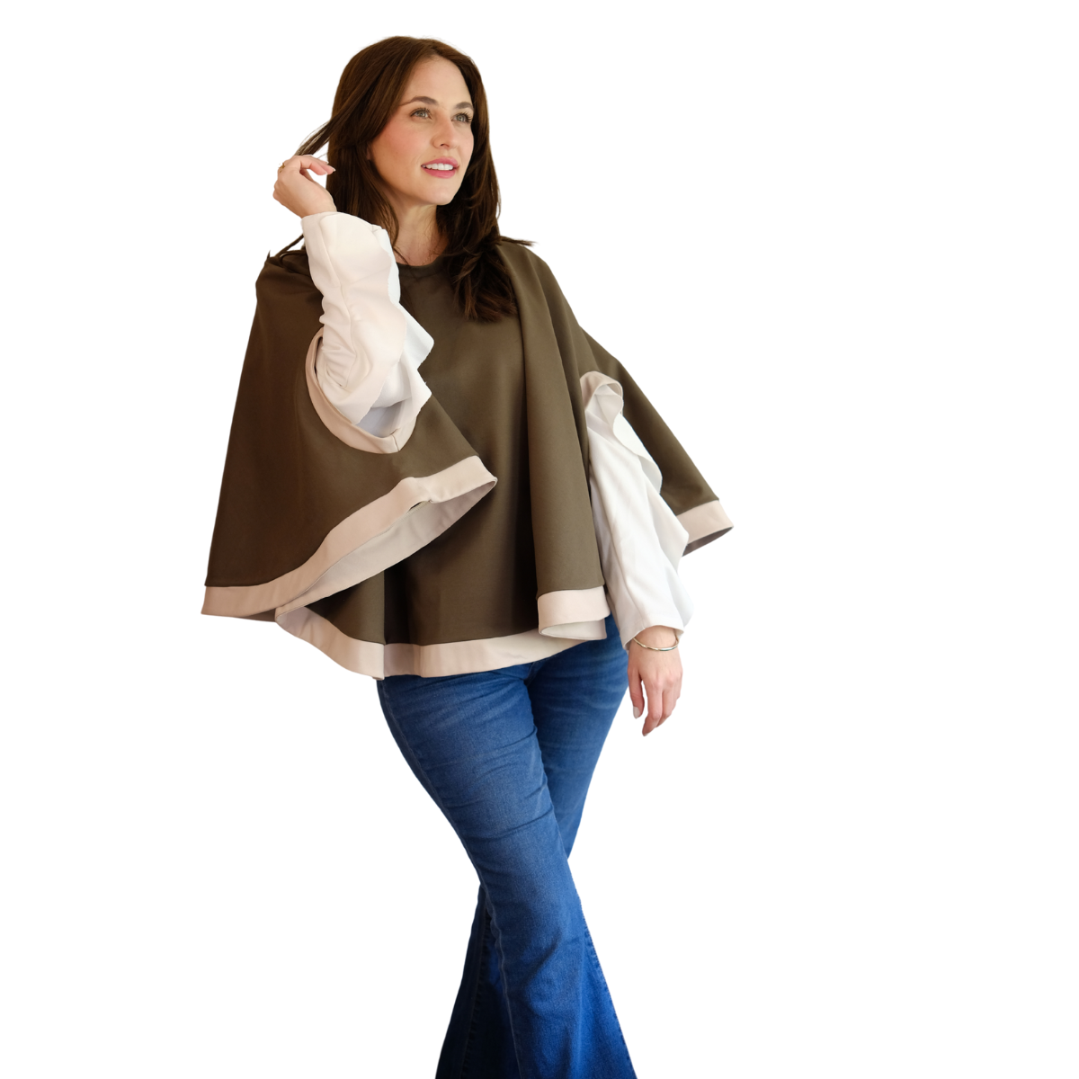 Descripción Técnica: Capa talla única con cuello redondo, aberturas ovaladas frontales para mangas en contraste igual que los ruedos.