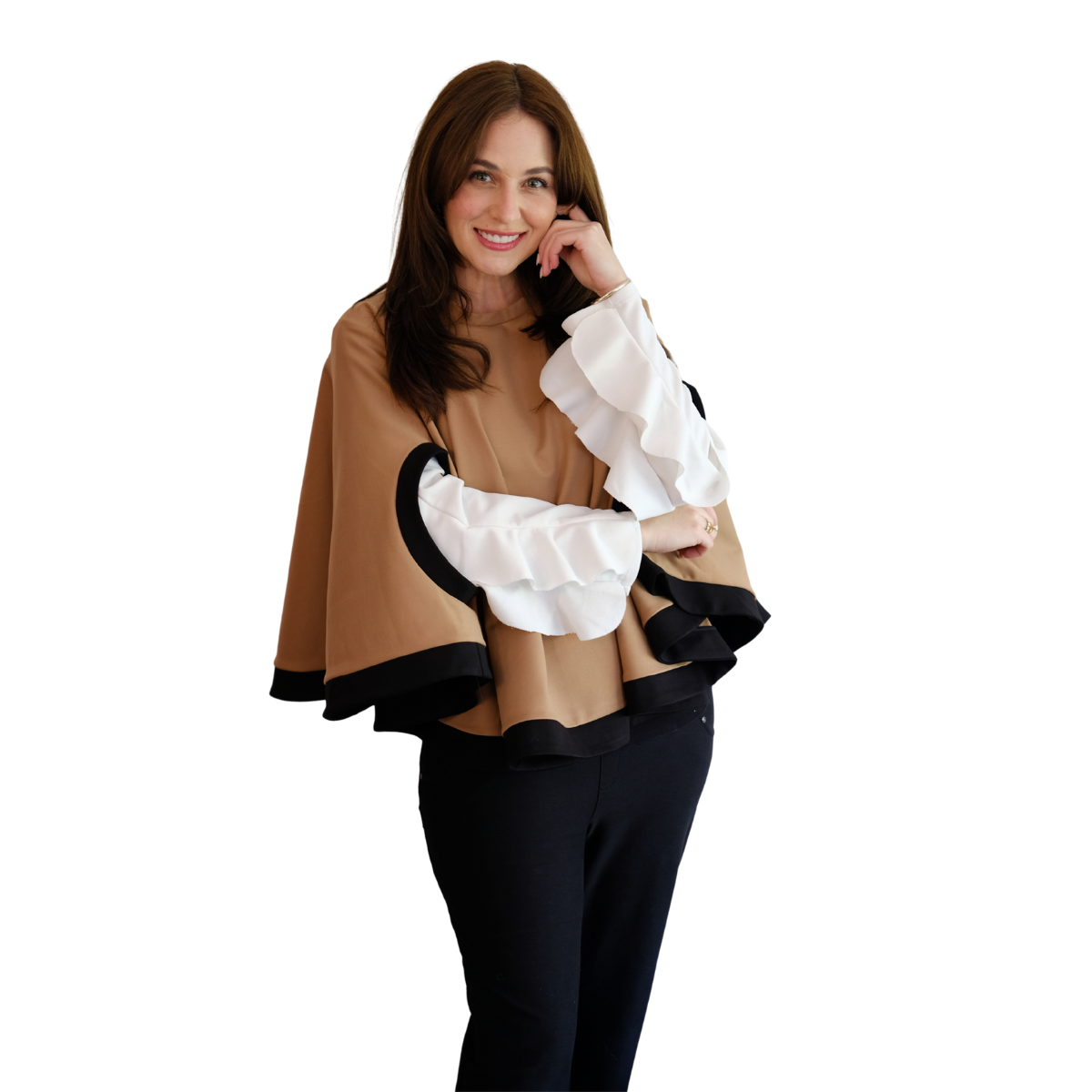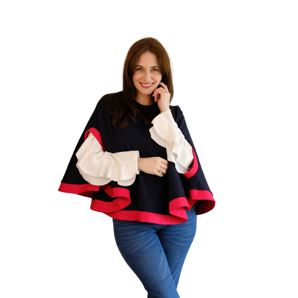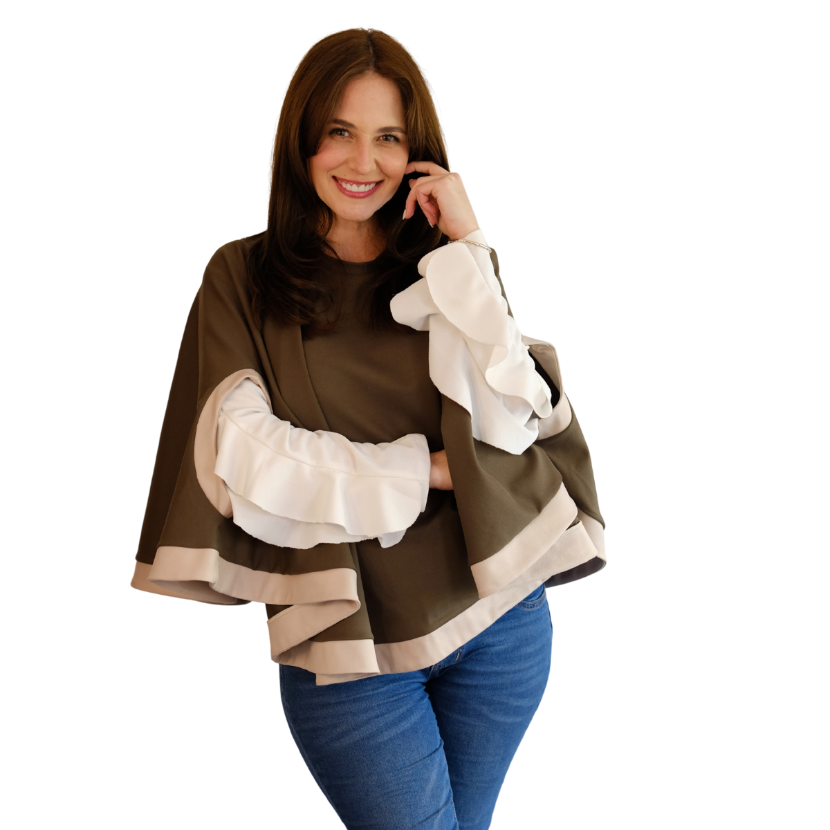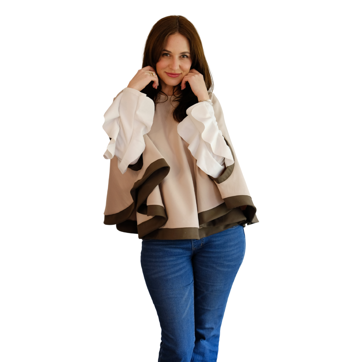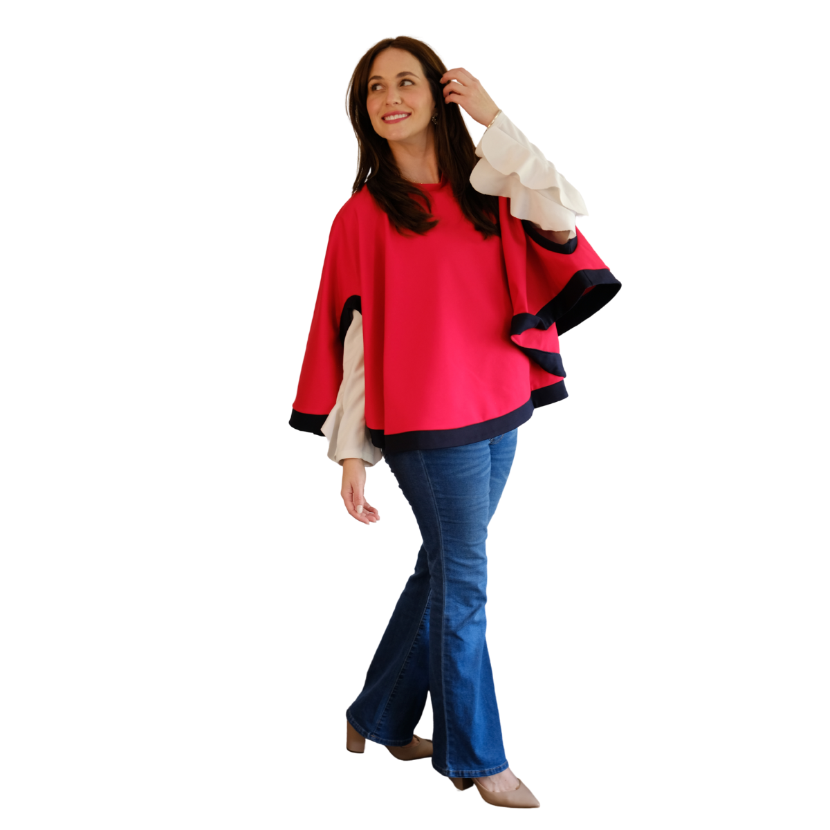Descripción Técnica: Capa talla única con cuello redondo, aberturas ovaladas frontales para mangas en contraste igual que los ruedos.