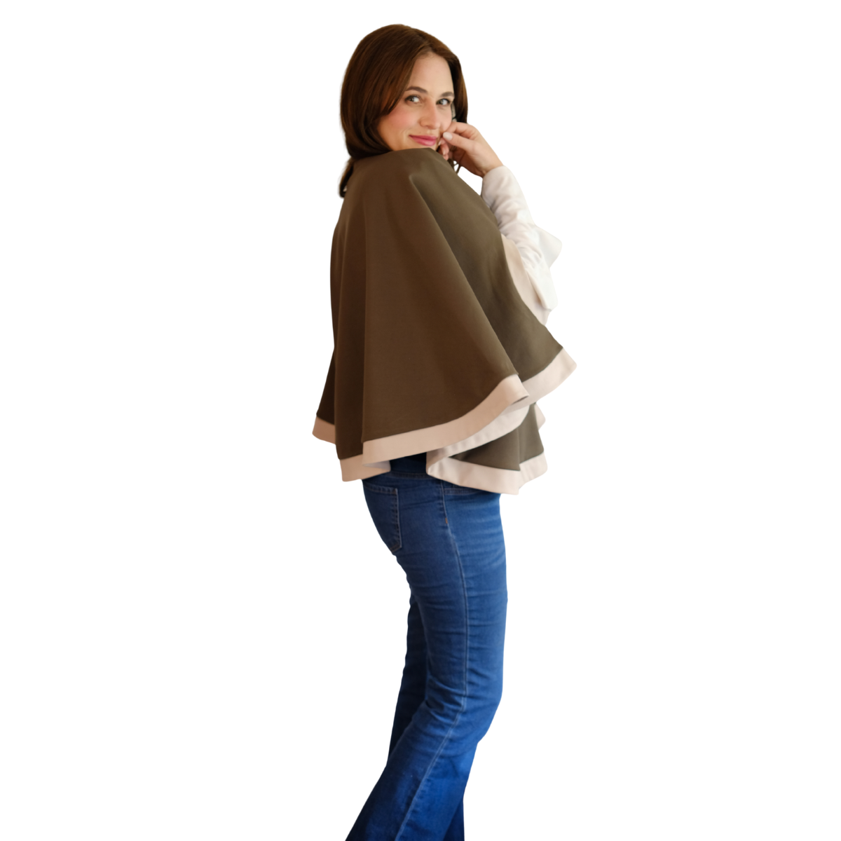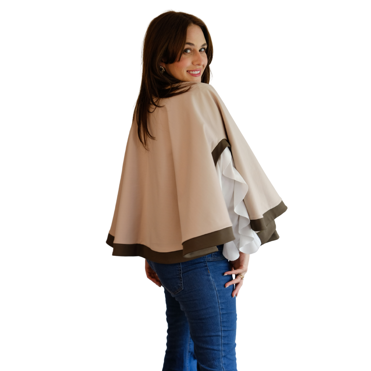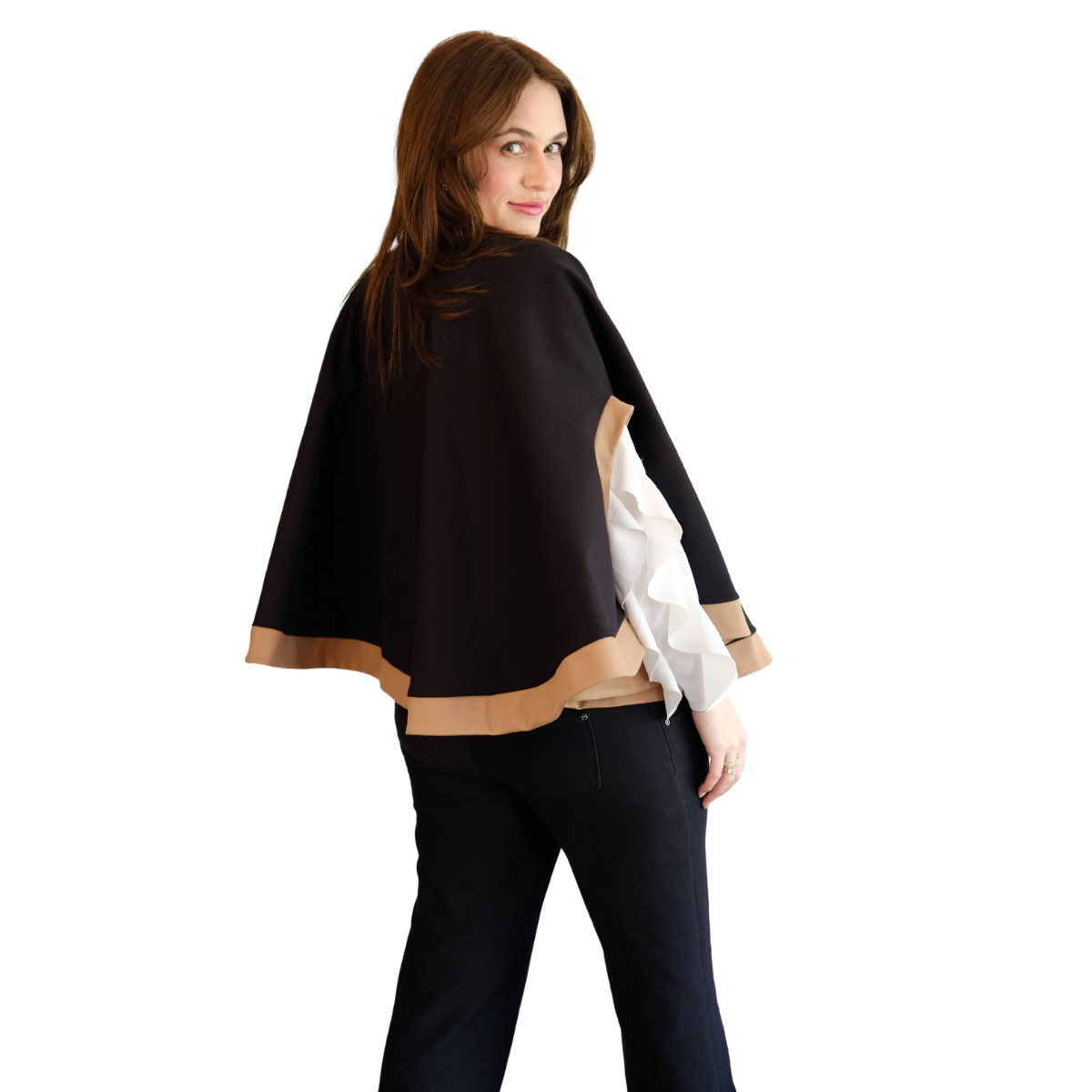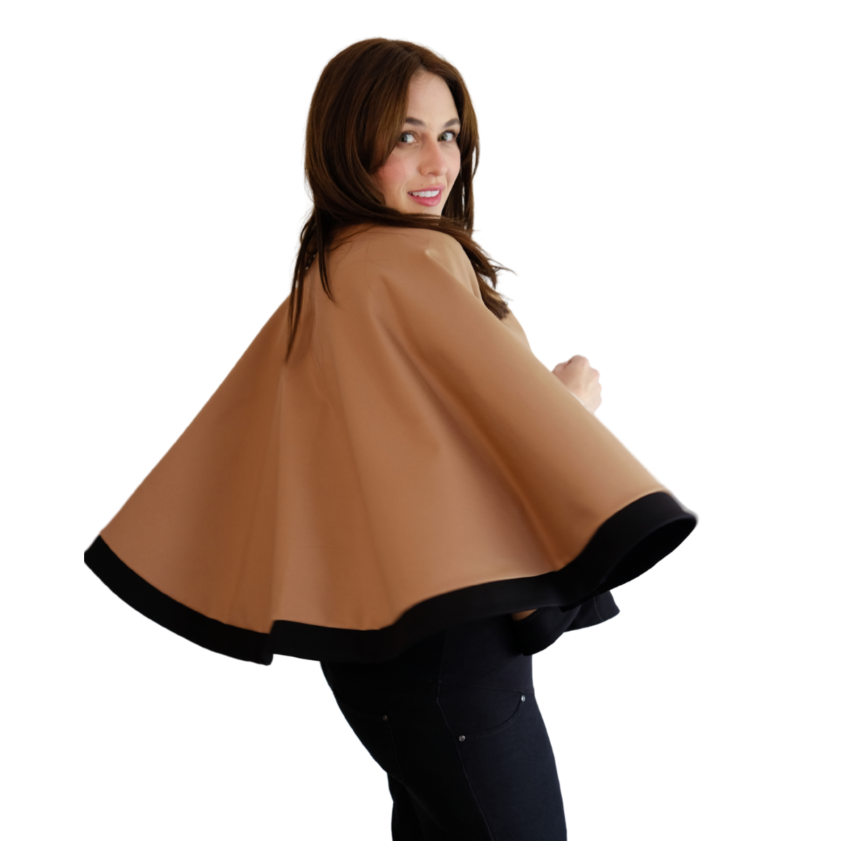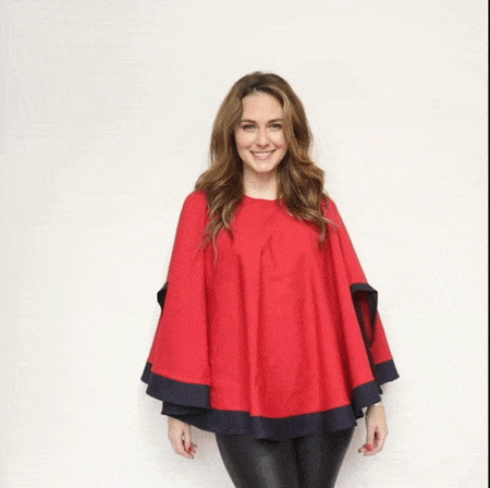 Descripción de Estefi: “ Sabías que nuestra capa Matilde también te la puedes poner como chaleco! Pasas la abertura donde metes la cabeza para la espalda y el excedente tela lo pones también hacia la espalda, éste cubre el hueco y quedas con chaleco! Me parece una capa comodísima, de un largo ideal y que al tener dos colores combina con muchas cosas! Es tan formal o informal como tu quieras! Como es en algodón y spándex no es tan pesada y abriga, es sin duda de mis favoritas!”