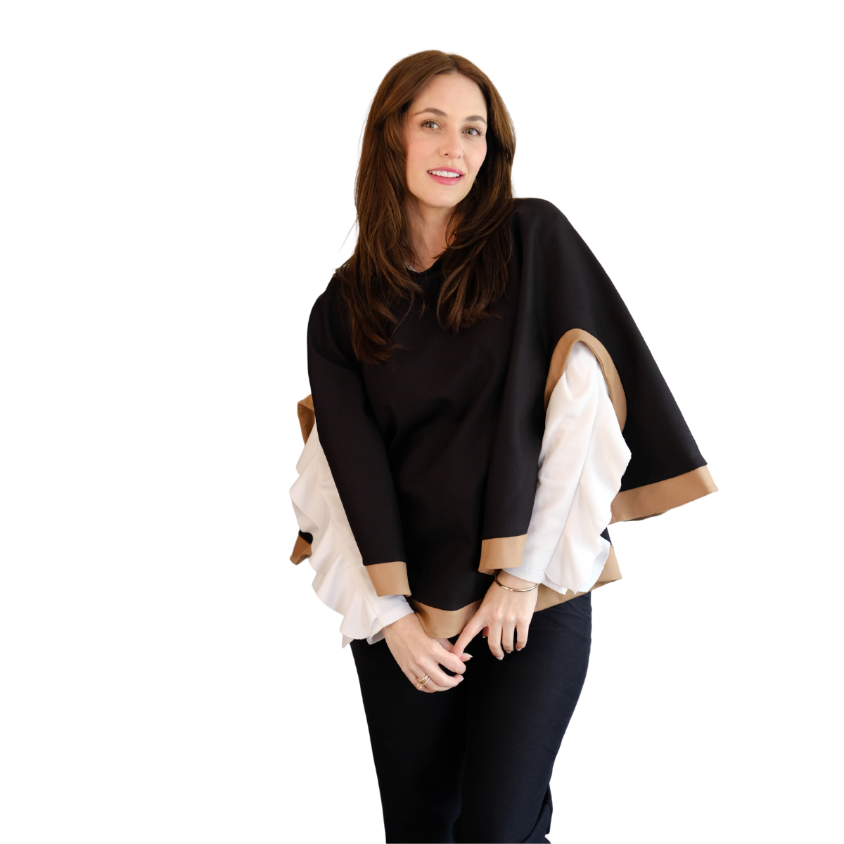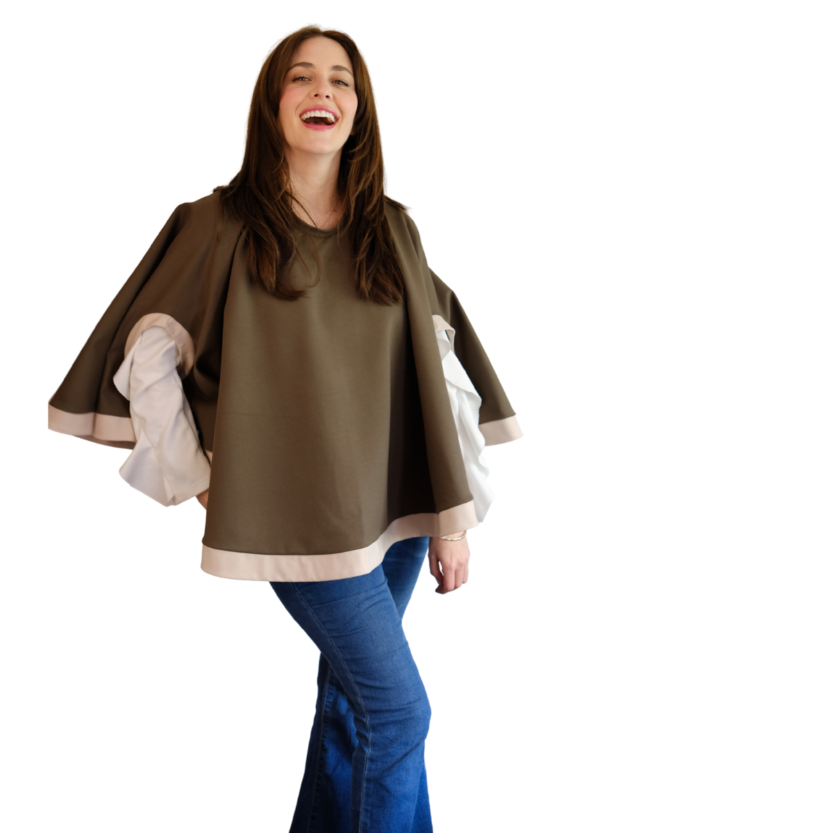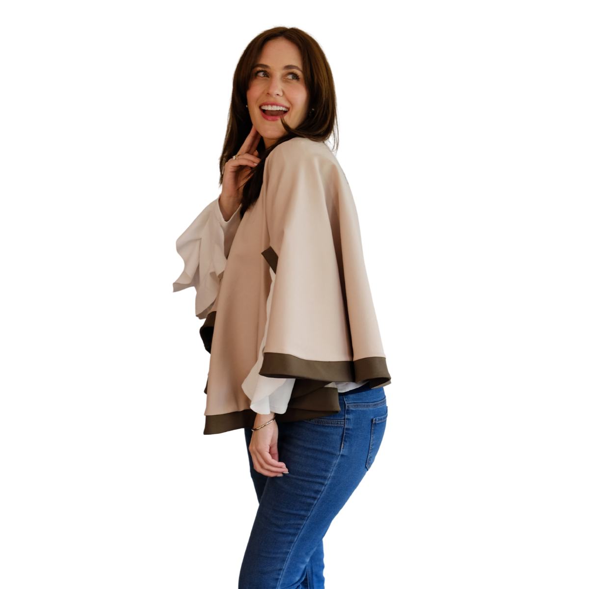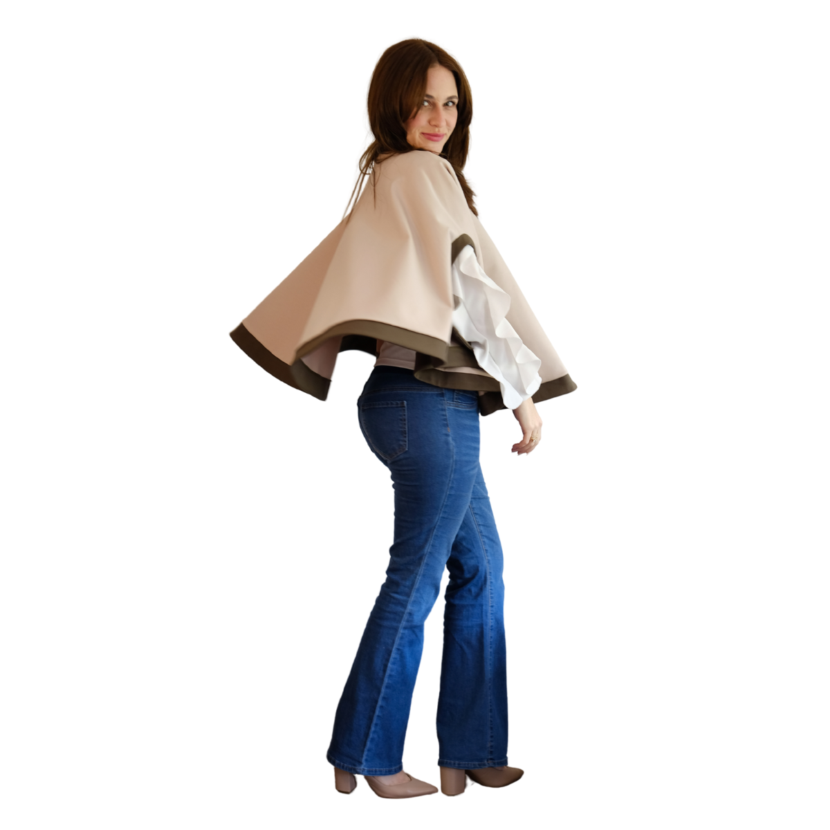 Descripción de Estefi: “ Sabías que nuestra capa Matilde también te la puedes poner como chaleco! Pasas la abertura donde metes la cabeza para la espalda y el excedente tela lo pones también hacia la espalda, éste cubre el hueco y quedas con chaleco! Me parece una capa comodísima, de un largo ideal y que al tener dos colores combina con muchas cosas! Es tan formal o informal como tu quieras! Como es en algodón y spándex no es tan pesada y abriga, es sin duda de mis favoritas!”