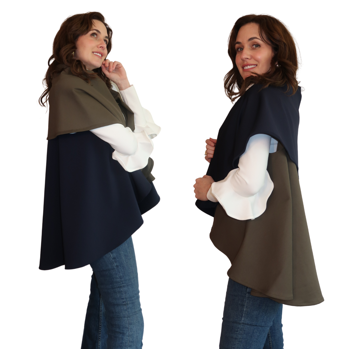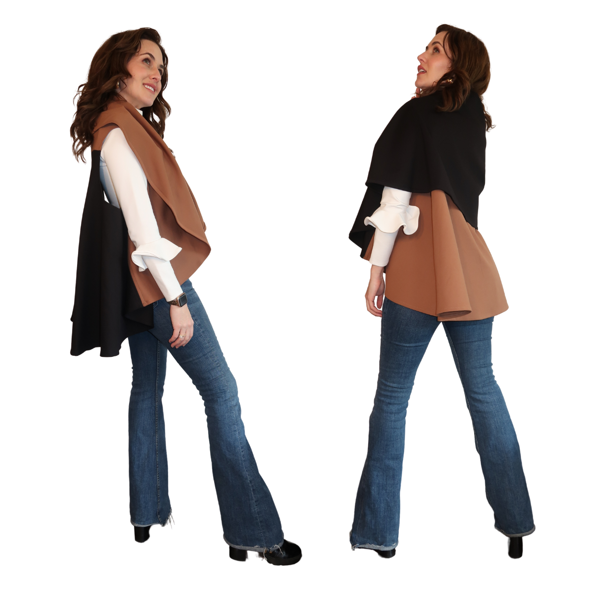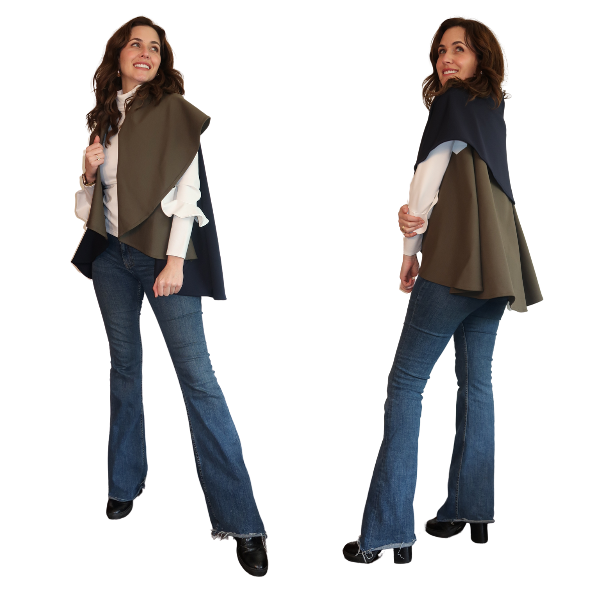 Descripción de Estefi “ Nuestro Chaleco/Capa Miranda es una modificación de la Kira, en material con mejor caída, más amplias las sisas y más larga. Puedes rotarla y elegir cuál color quieres que esté arriba así que tienes el doble de looks que puedes combinar. También puedes escoger si la quieres como chaleco o capa y la puedes entallar con un cinturón y se ve esectacular. .”