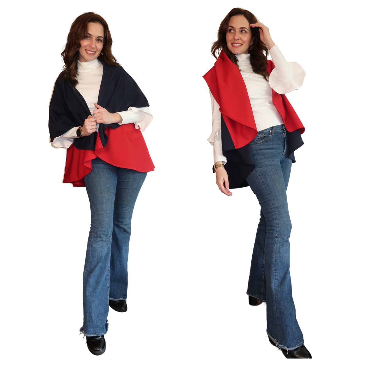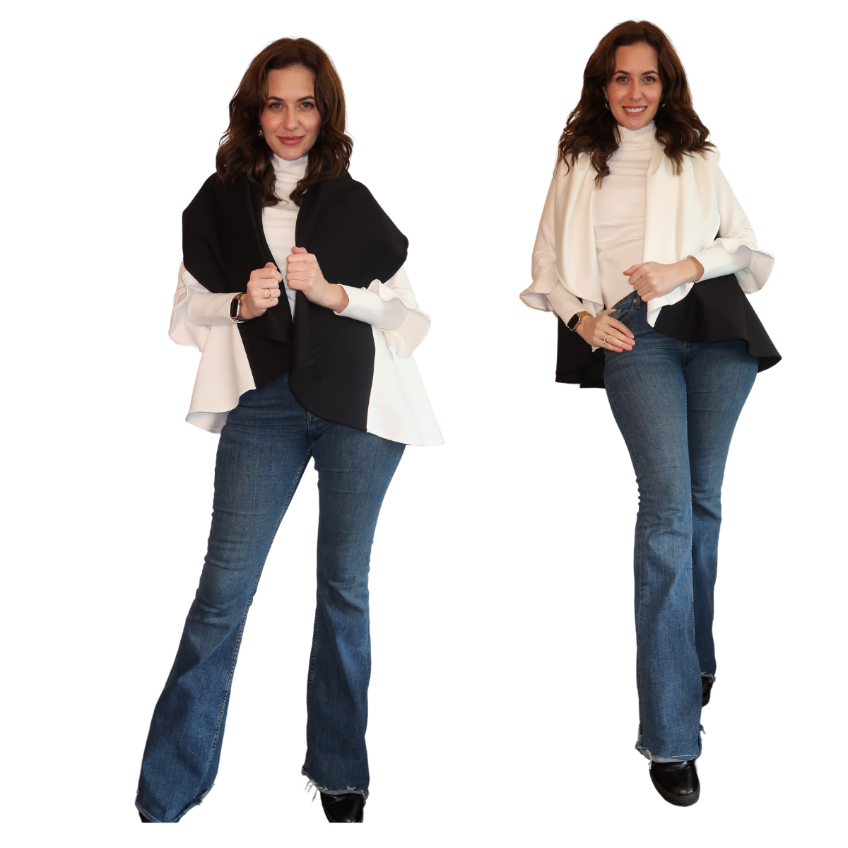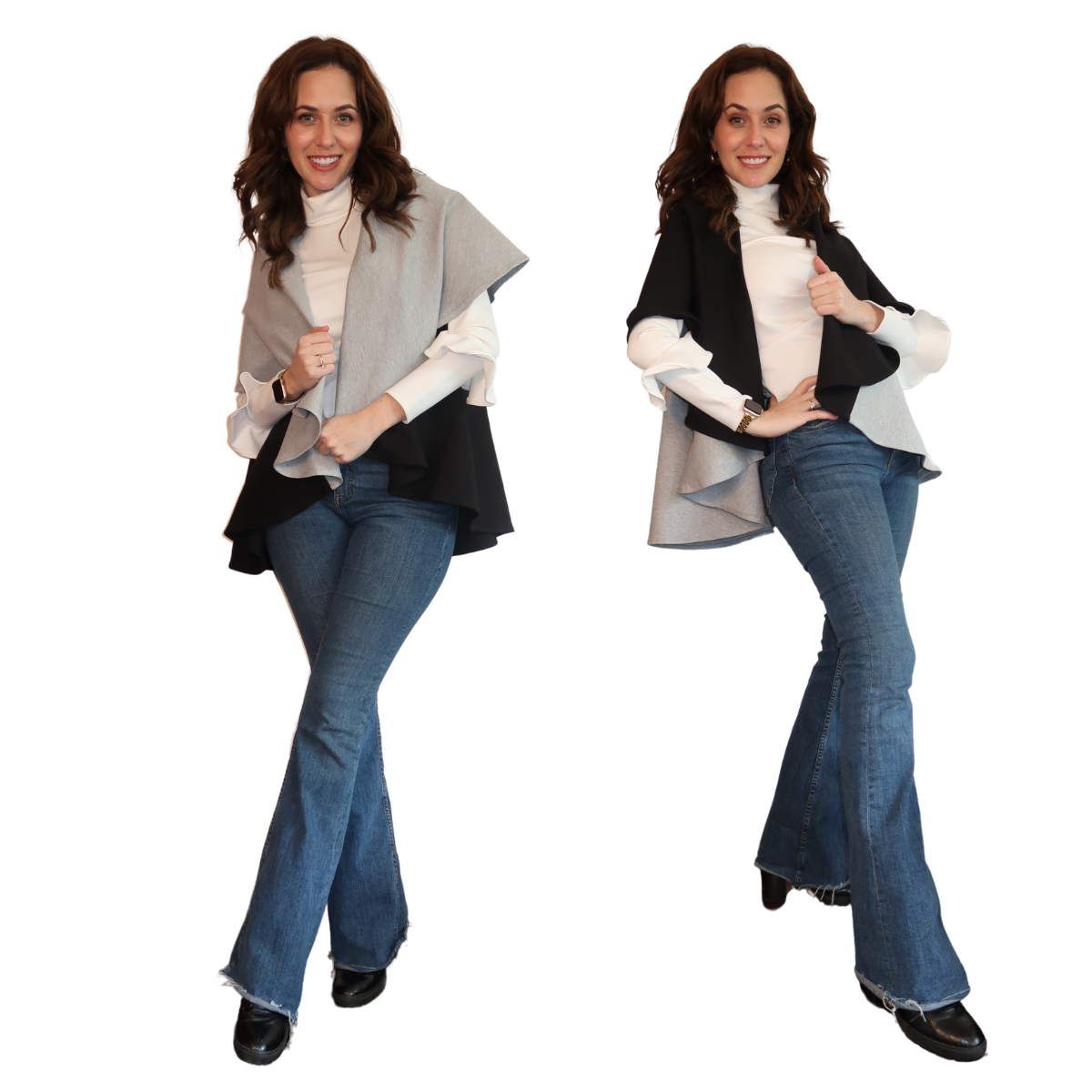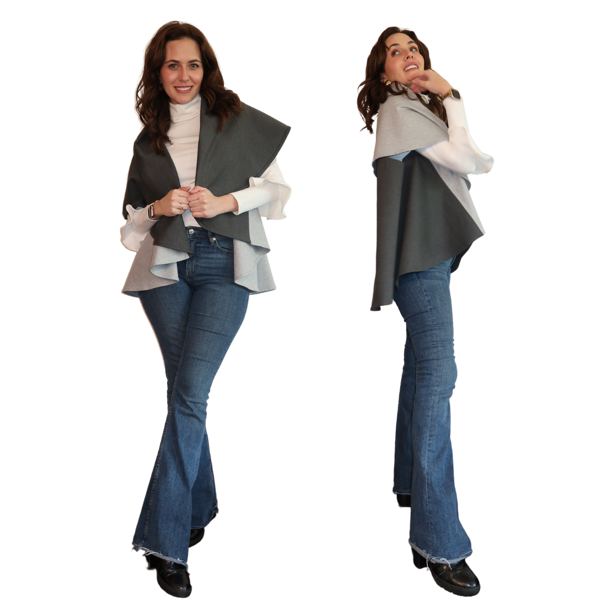 Descripción de Estefi “ Nuestro Chaleco/Capa Miranda es una modificación de la Kira, en material con mejor caída, más amplias las sisas y más larga. Puedes rotarla y elegir cuál color quieres que esté arriba así que tienes el doble de looks que puedes combinar. También puedes escoger si la quieres como chaleco o capa y la puedes entallar con un cinturón y se ve esectacular. .”