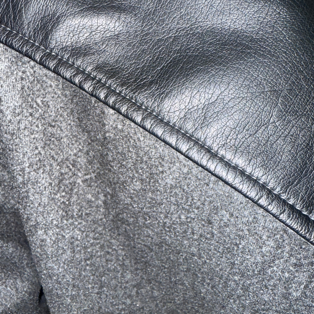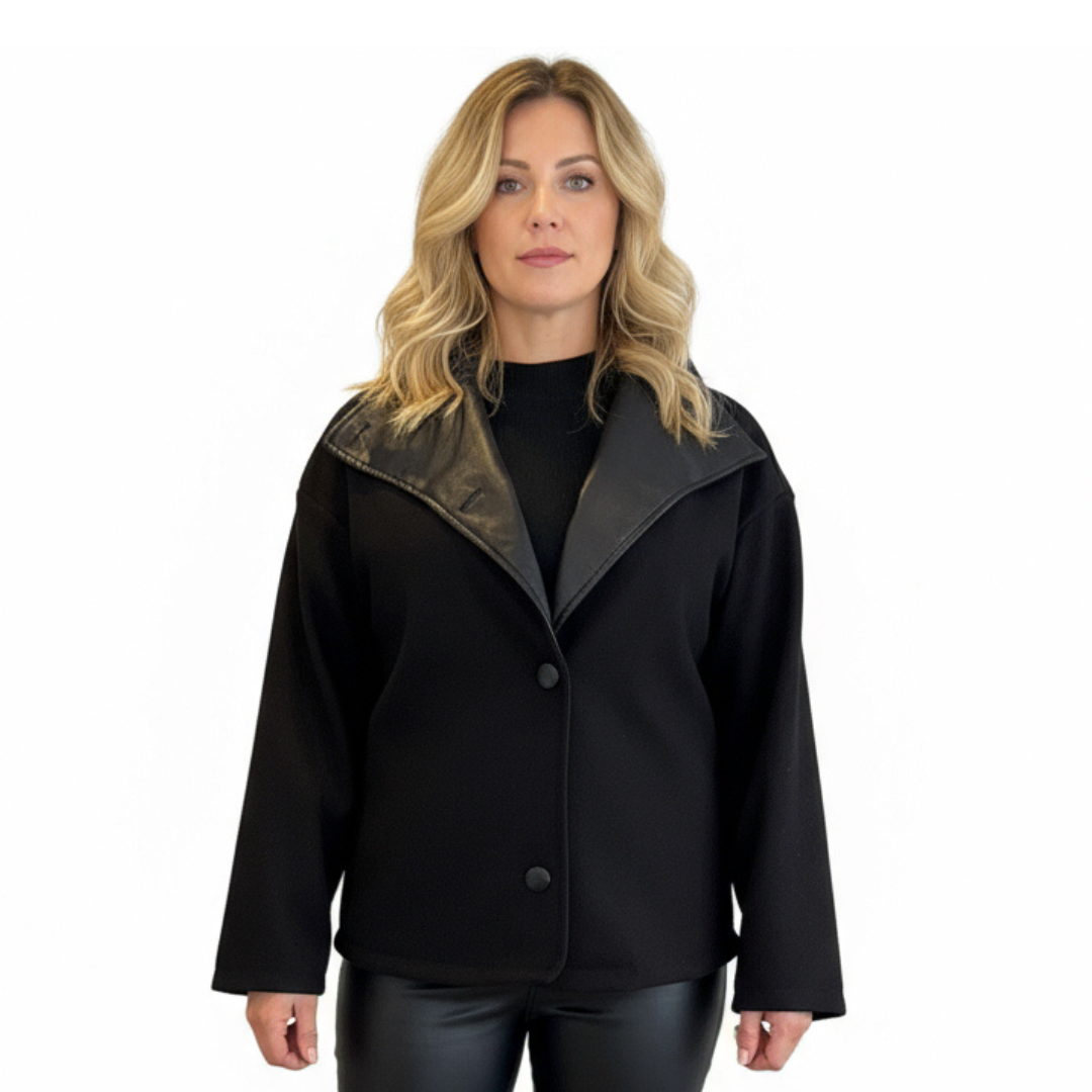 Abotonada hasta la mitad, dejando ver el contraste del cuello en cuerina.