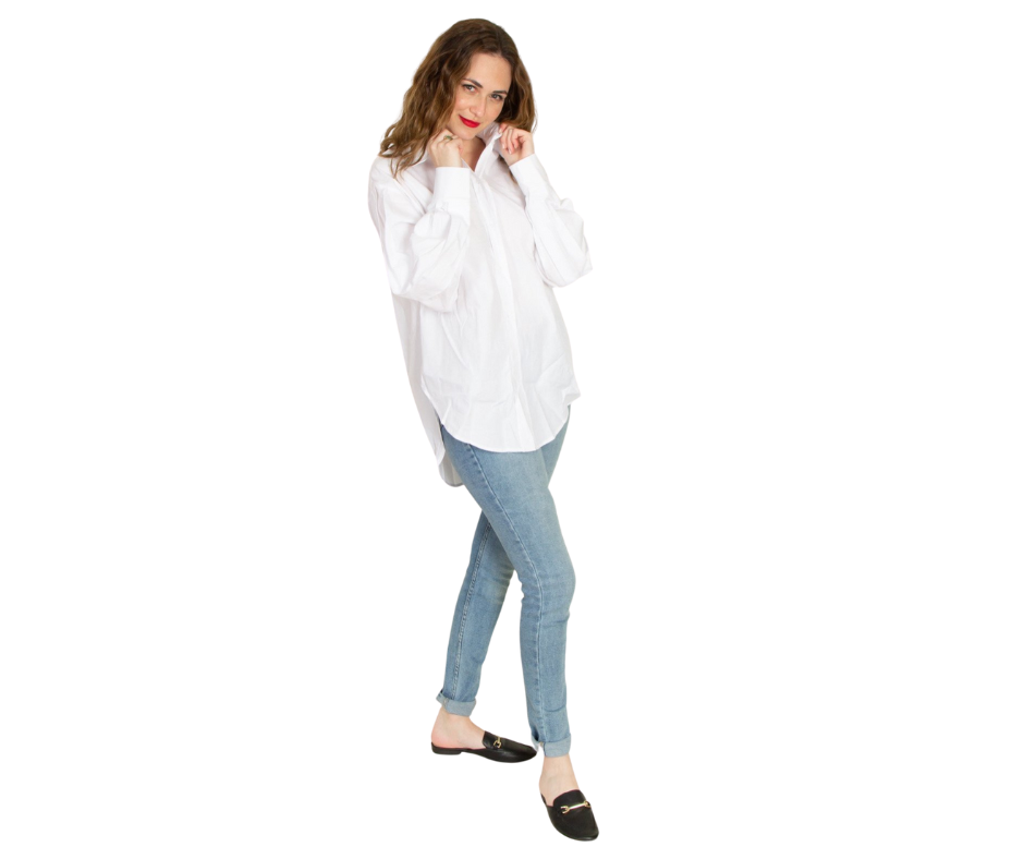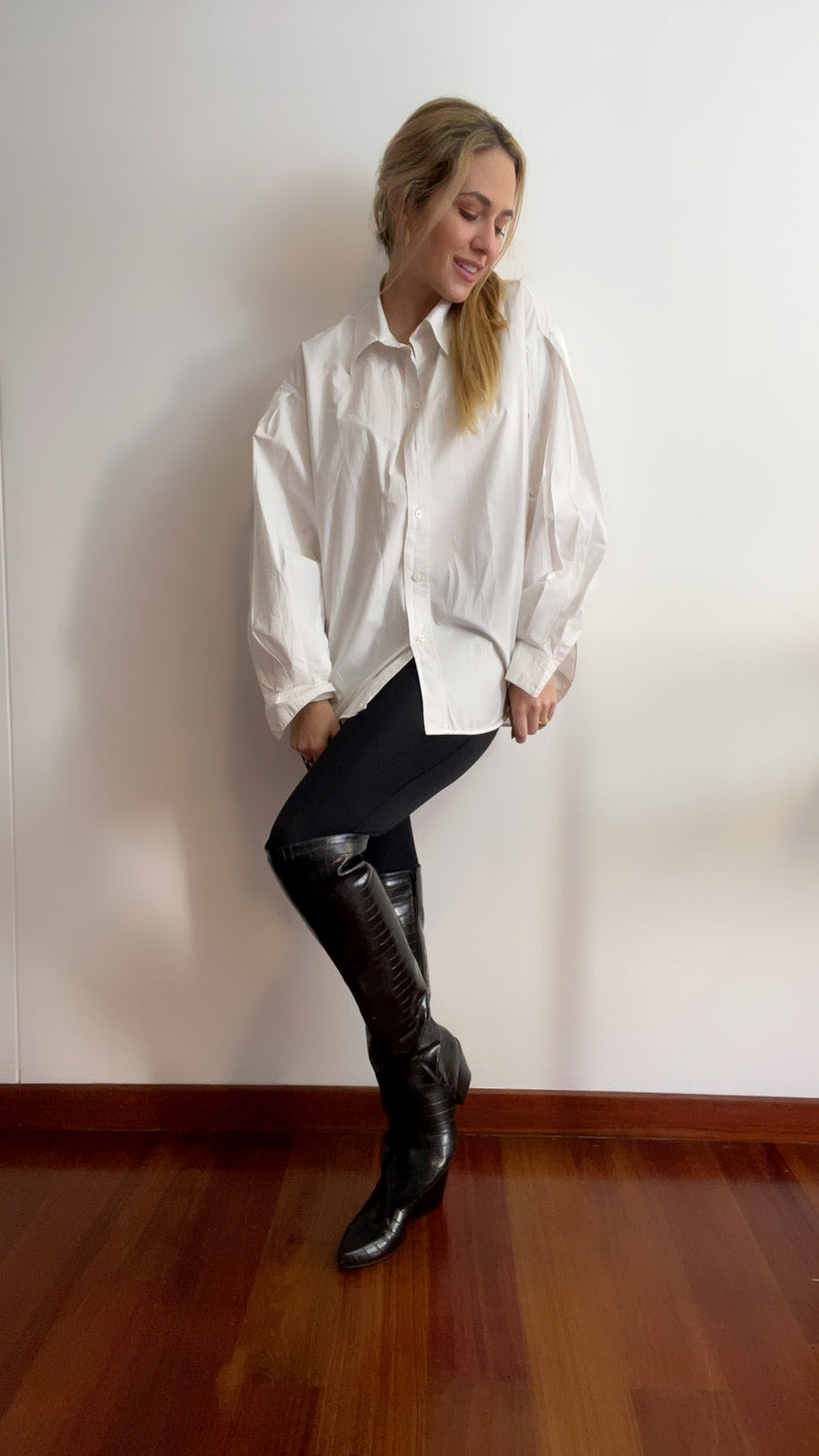 "Quería tener una camisa básica que fuera como si se la robara a mi novio pero que quedara perfecta. Esas camisas grandes de hombres me encantan porque el cuello y el puño son duros y con forma espectacular. Hice la manga caída y con mucho volumen para darle un toque más femenino y es más corta adelante que atrás y con corte lateral para que te la puedas anudar sin problema sin perder la forma y que atrás siga del mismo largo y tape la cola para poder ponértela con leggings y sentirte segura."