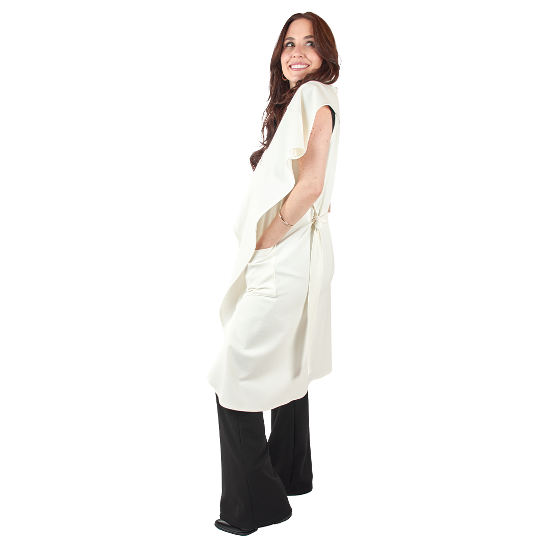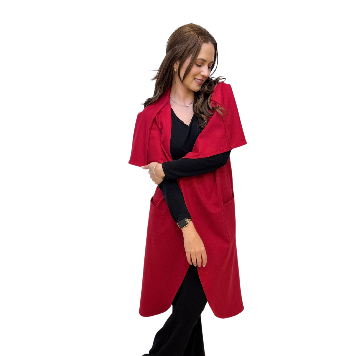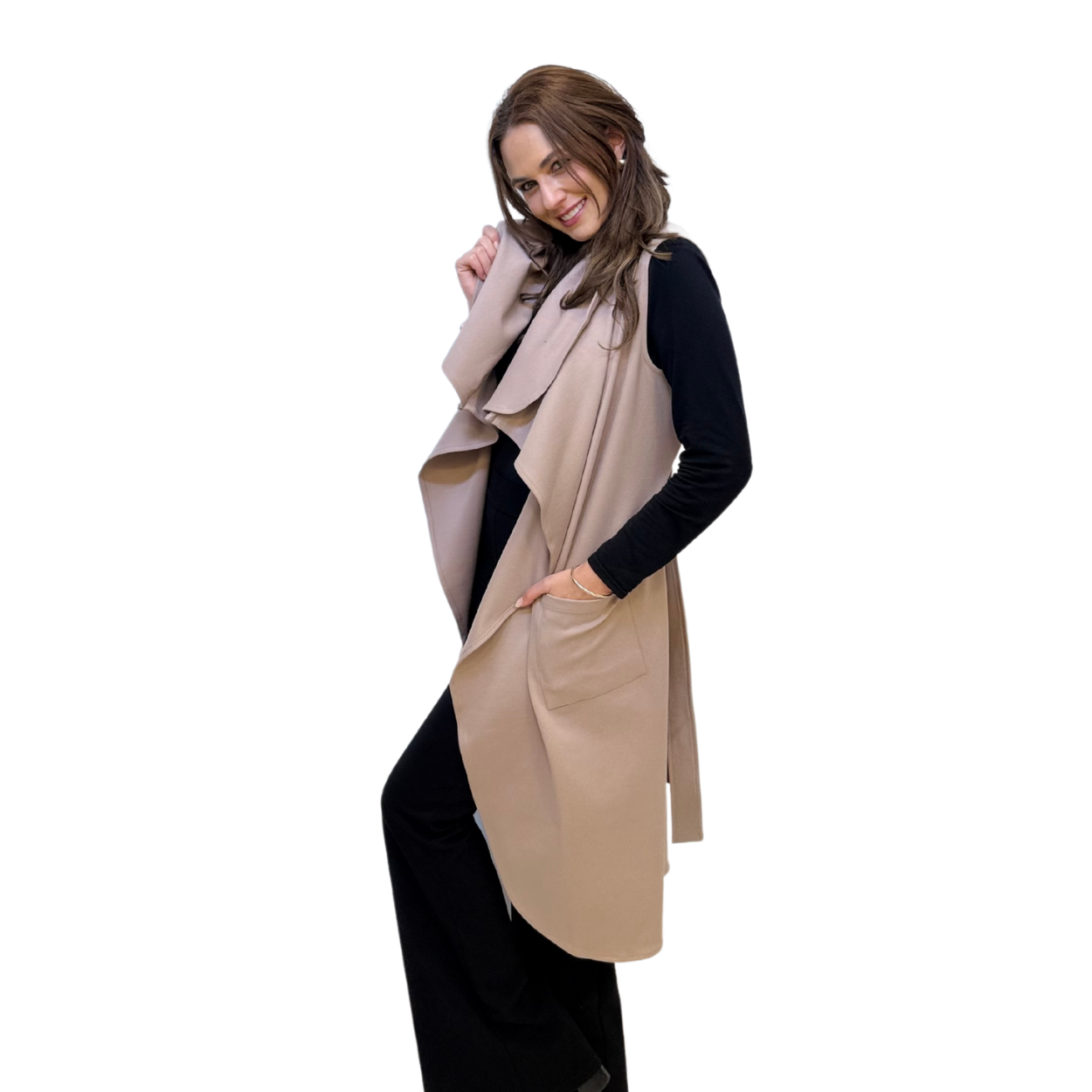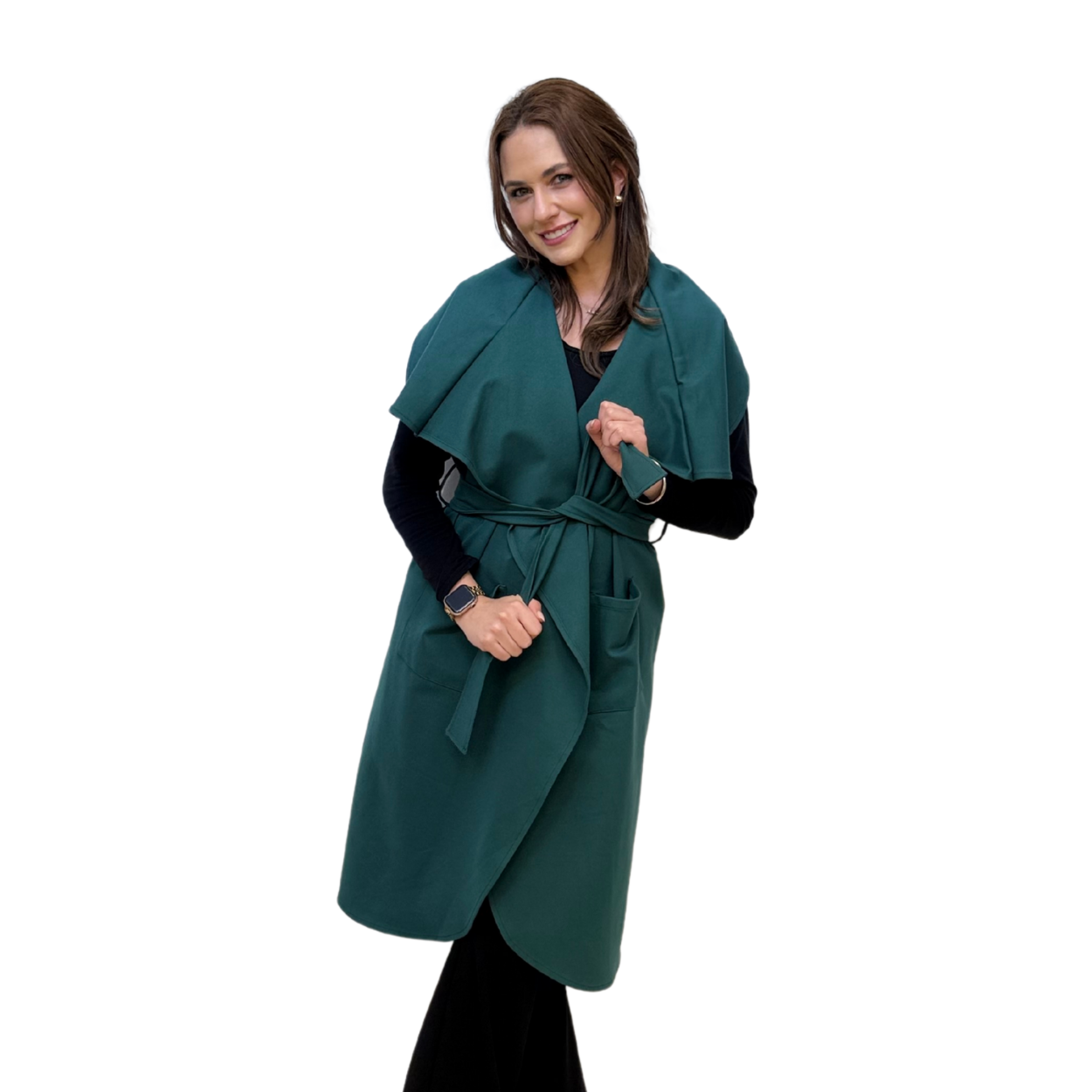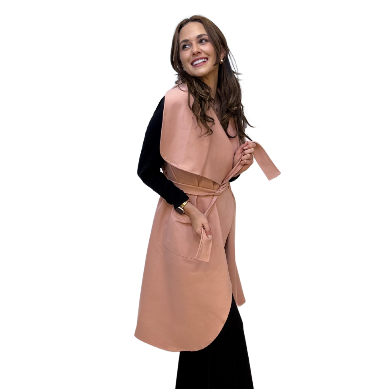 El Chaleco Luciana tiene un corte asimétrico, corto al frente y con caída progresiva en la parte trasera, creando un efecto estilizado. Su solapa curva puede usarse sobre los hombros para más cobertura o colgar para un look relajado. Talla única que se adapta a diferentes tipos de cuerpo, con bolsillos laterales funcionales y un cinturón removible para ajustar la cintura o llevarlo suelto. Ideal para oficina, días casuales o combinar con diferentes estilos, desde formales hasta informales. Hecho de tela liviana con buena caída, es versátil, cómodo y adecuado para cualquier temporada.
