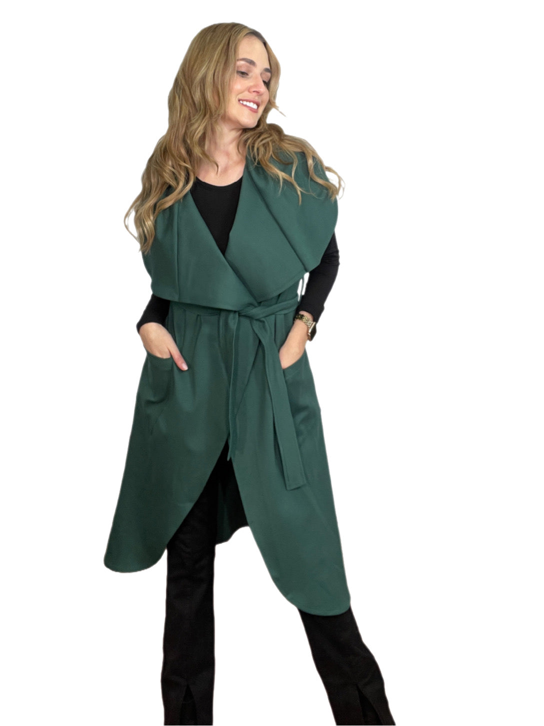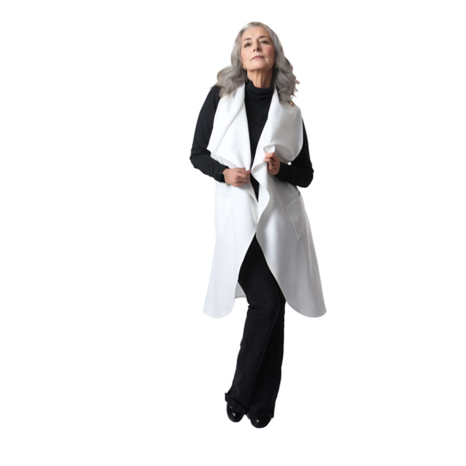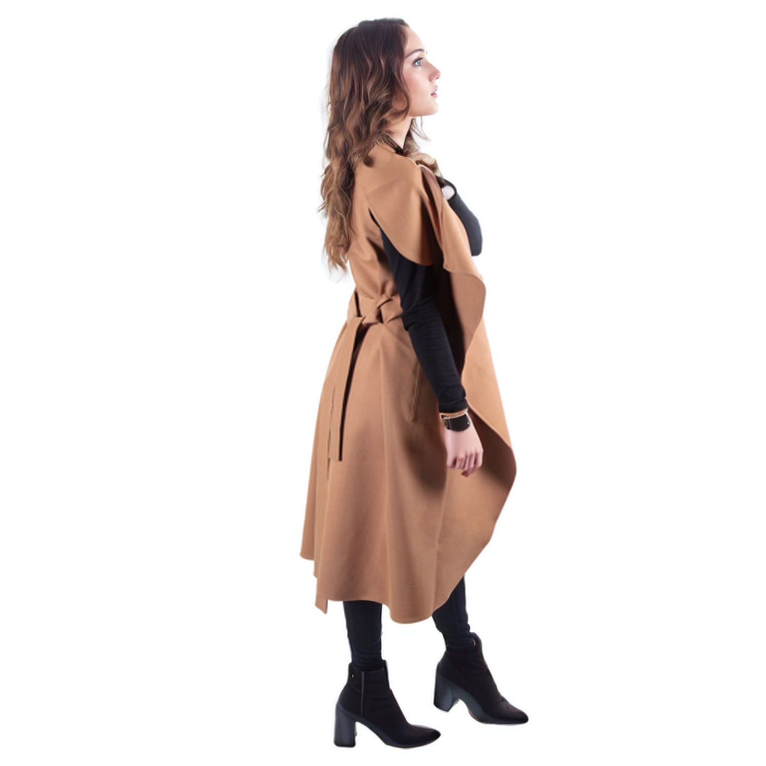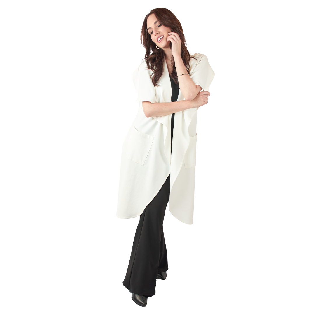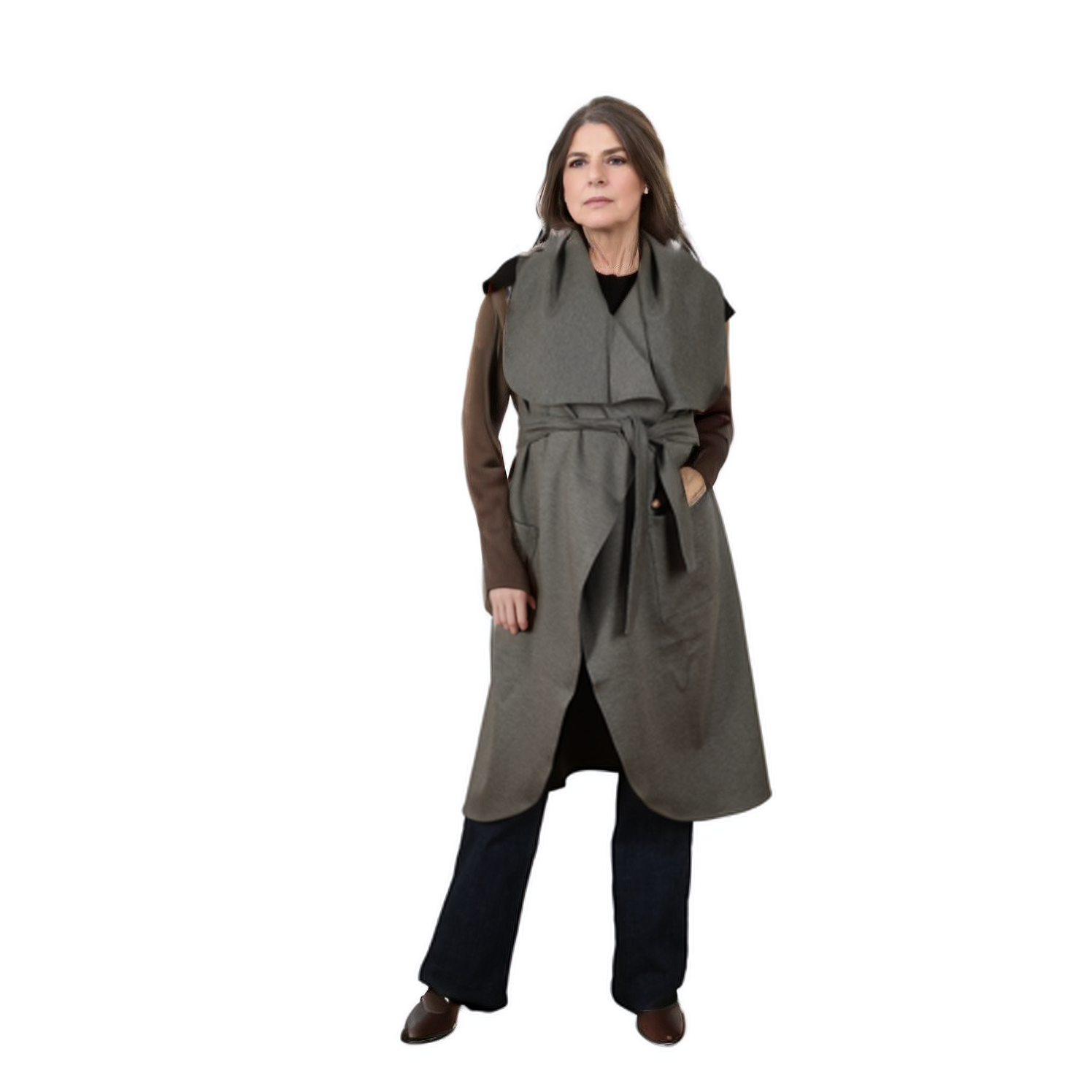 El Chaleco Luciana tiene un corte asimétrico, corto al frente y con caída progresiva en la parte trasera, creando un efecto estilizado. Su solapa curva puede usarse sobre los hombros para más cobertura o colgar para un look relajado. Talla única que se adapta a diferentes tipos de cuerpo, con bolsillos laterales funcionales y un cinturón removible para ajustar la cintura o llevarlo suelto. Ideal para oficina, días casuales o combinar con diferentes estilos, desde formales hasta informales. Hecho de tela liviana con buena caída, es versátil, cómodo y adecuado para cualquier temporada.
