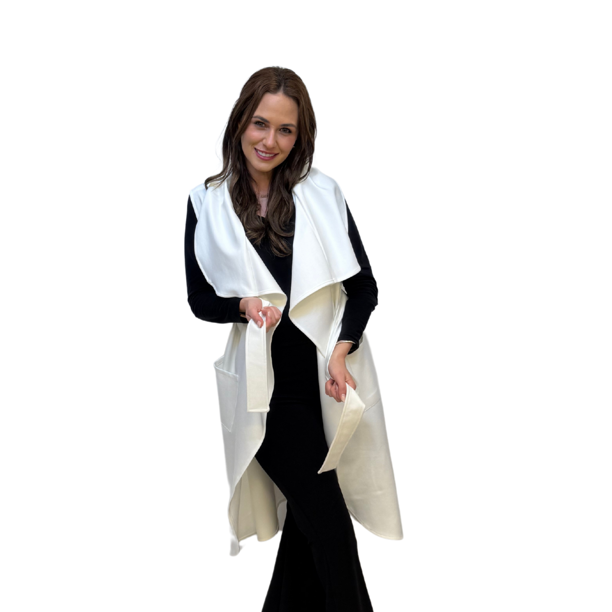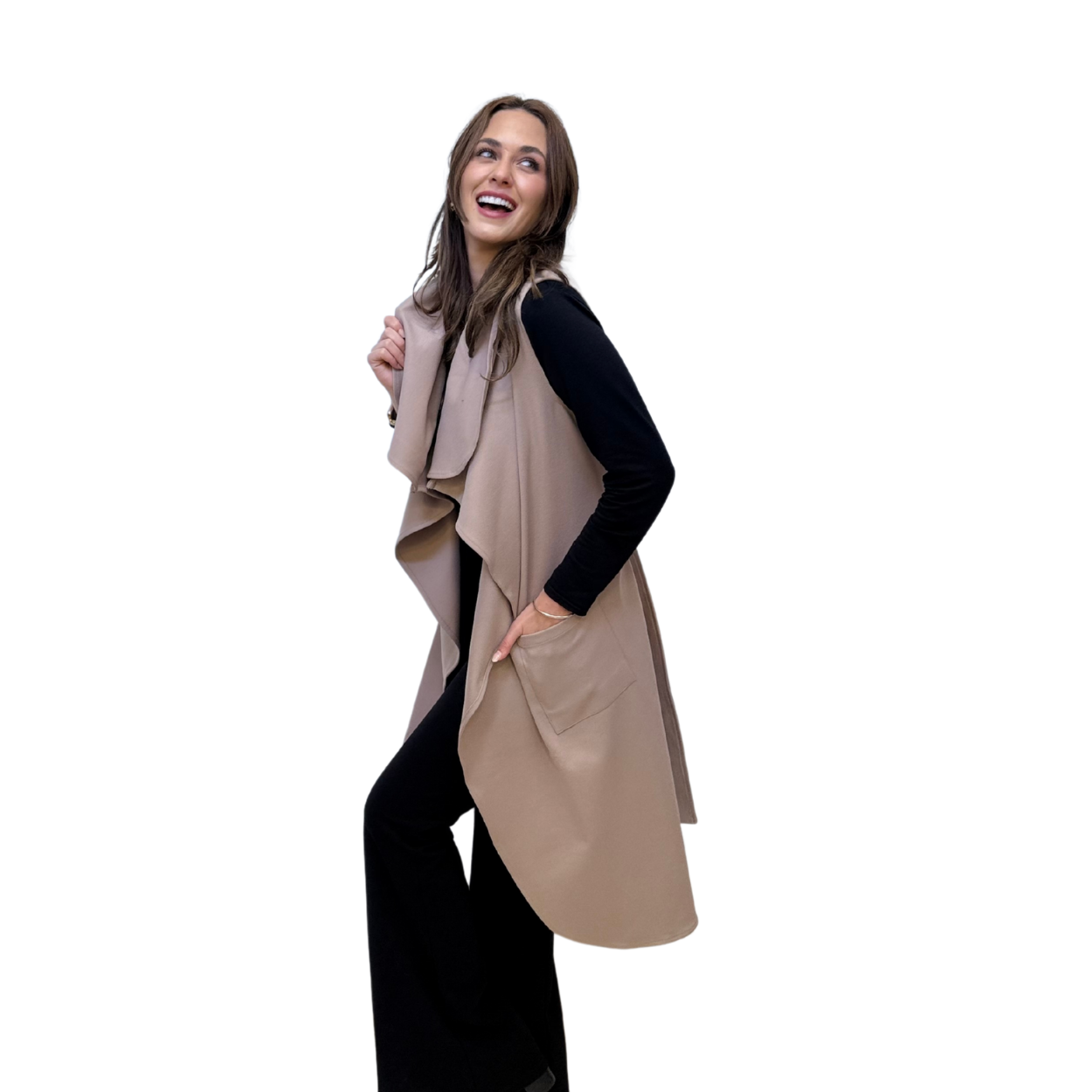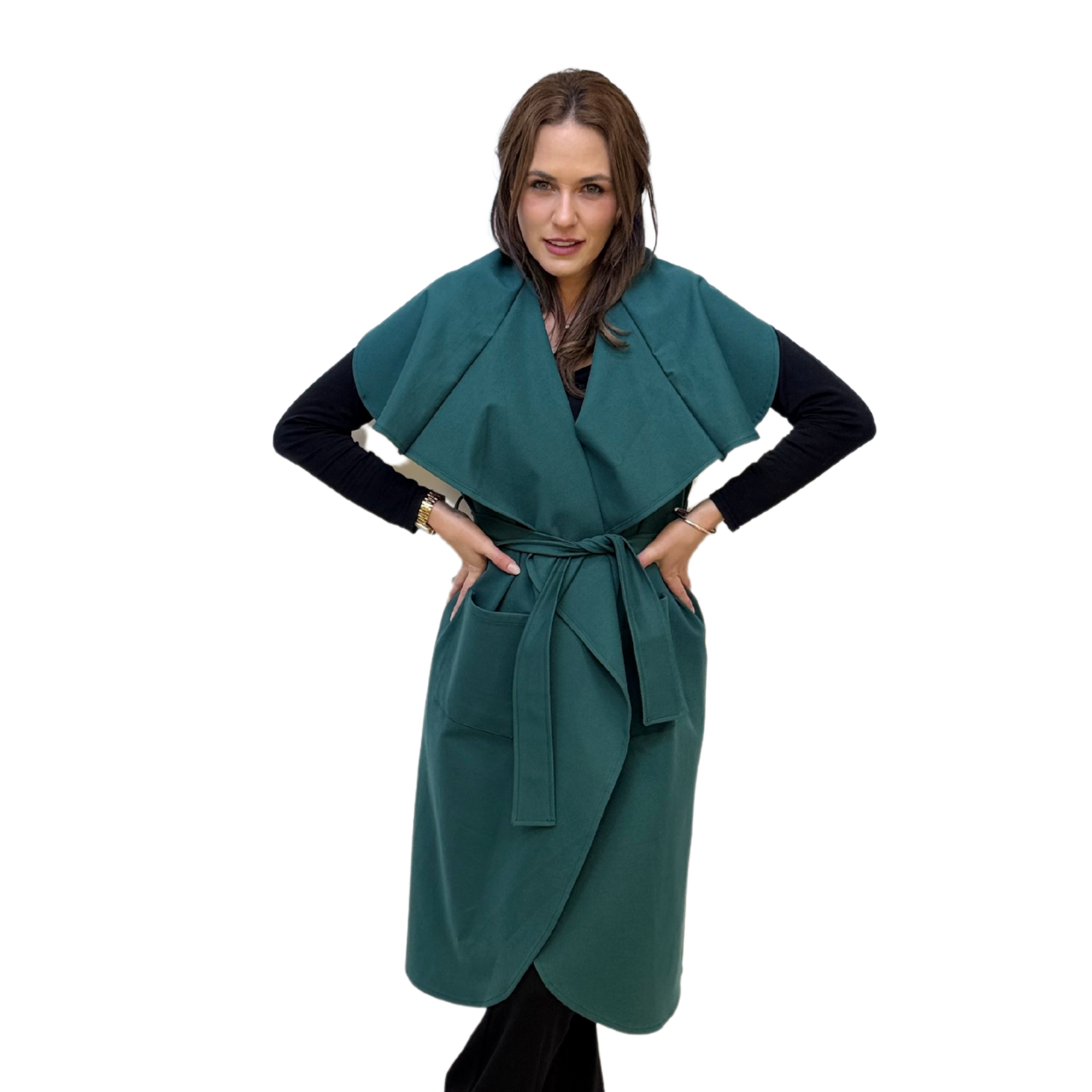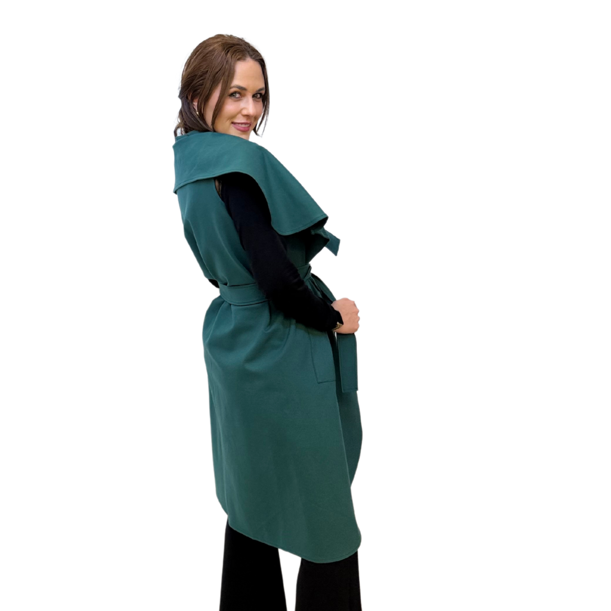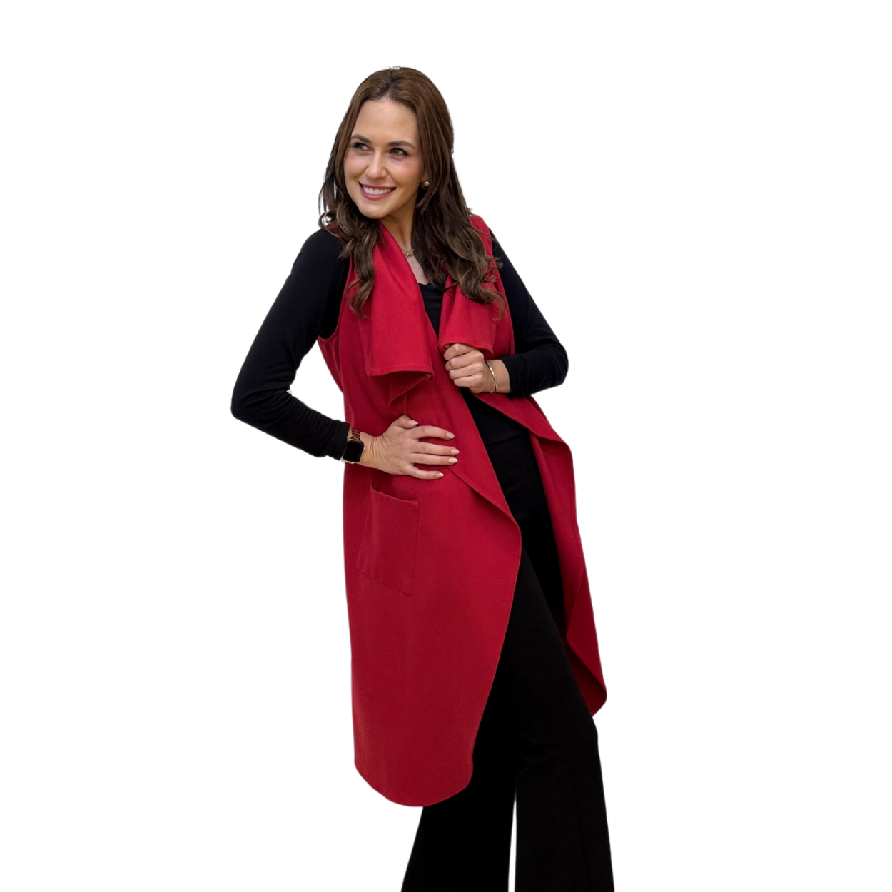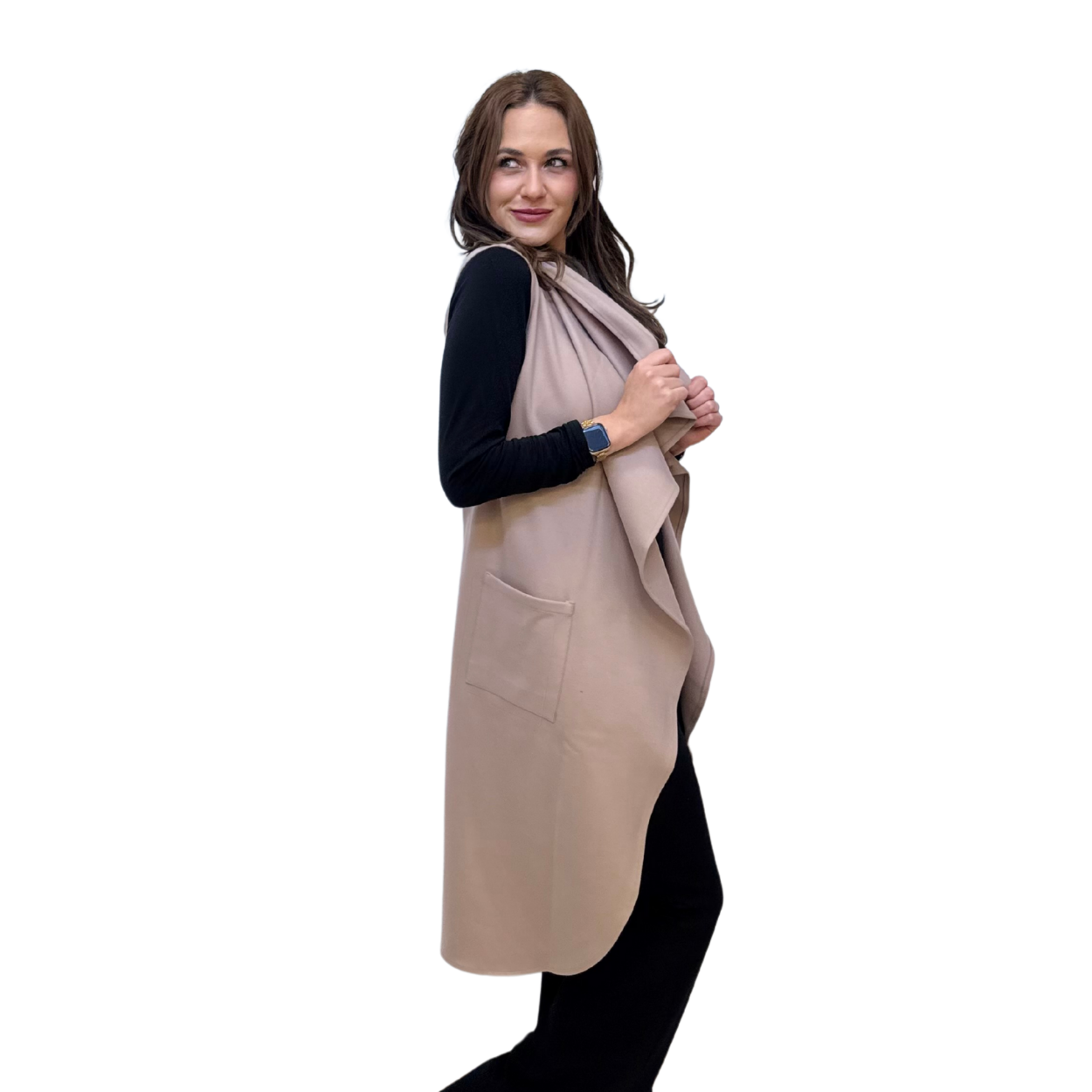 El Chaleco Luciana tiene un corte asimétrico, corto al frente y con caída progresiva en la parte trasera, creando un efecto estilizado. Su solapa curva puede usarse sobre los hombros para más cobertura o colgar para un look relajado. Talla única que se adapta a diferentes tipos de cuerpo, con bolsillos laterales funcionales y un cinturón removible para ajustar la cintura o llevarlo suelto. Ideal para oficina, días casuales o combinar con diferentes estilos, desde formales hasta informales. Hecho de tela liviana con buena caída, es versátil, cómodo y adecuado para cualquier temporada.
