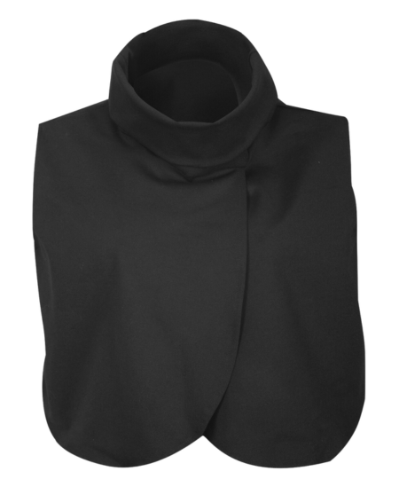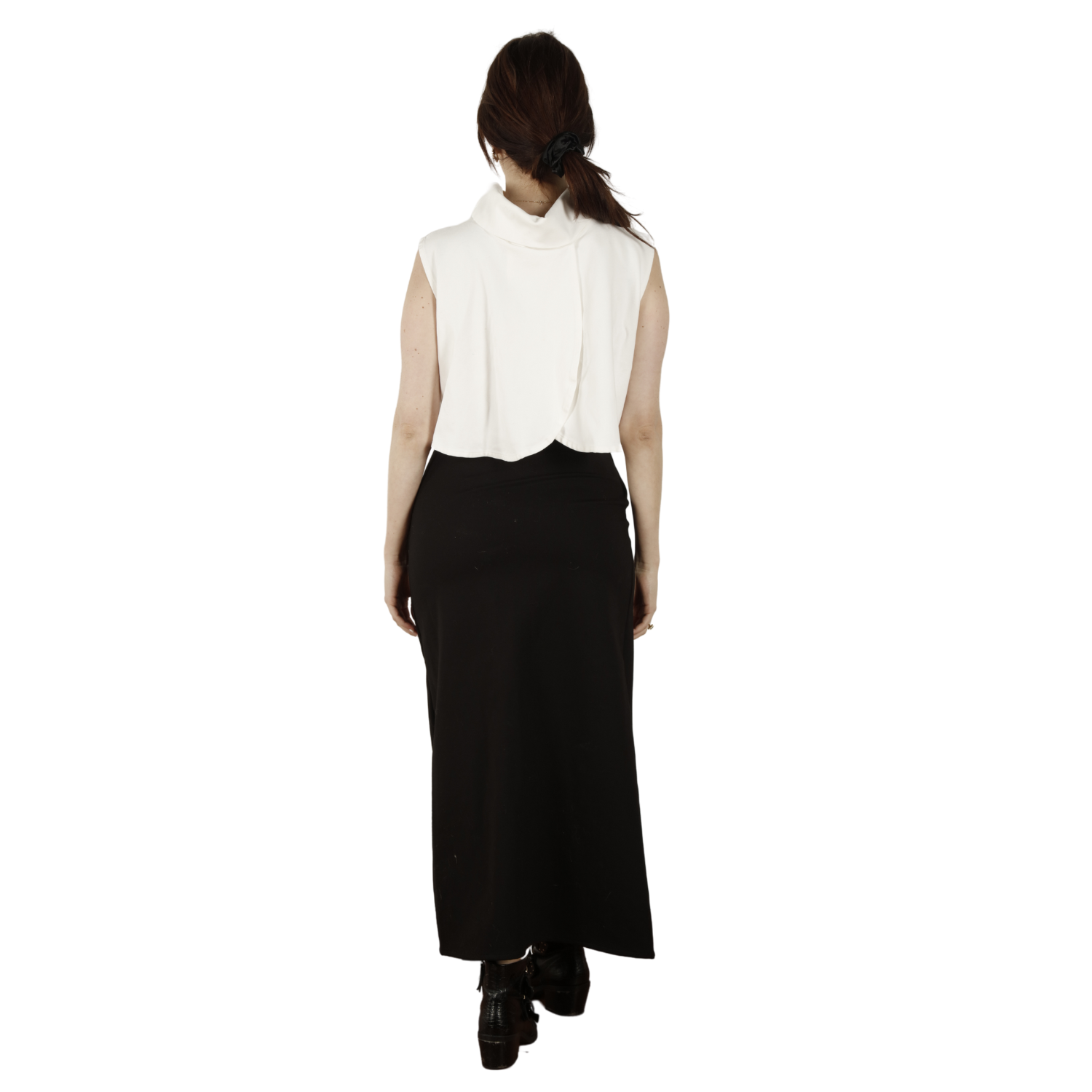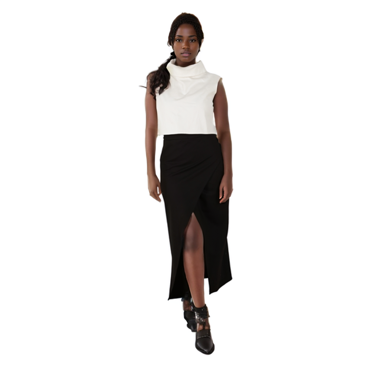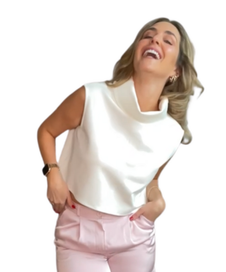 Crop top con cuello tortuga amplio, es un top cuadrado oversized, la idea es que quede suelto y boxy, tiene un cruce que puede utilizarse adelante o atrás.